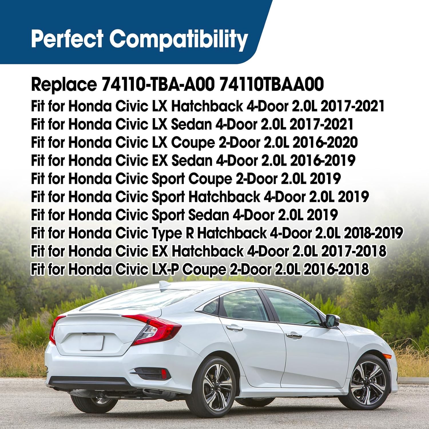 • Compatible Models: Fit for Honda Civic Sport Sedan 4-Door 2.0L 2019. Fit for Honda Civic Type R Hatchback 4-Door 2.0L 2018-2019. Fit for Honda Civic EX Hatchback 4-Door 2.0L 2017-2018. Fit for Honda Civic LX-P Coupe 2-Door 2.0L 2016-2018. Replace 74110-TBA-A00 74110TBAA00