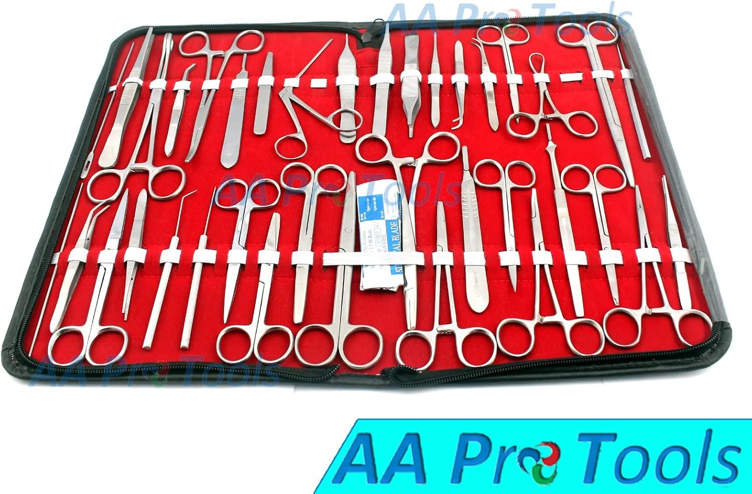 THE PACKAGE INCLUDES: 1 EA FOERSTER SPONG BALLENGER FORCEPS STRAIGHT 7 ” 1 EA KELLY HEMOSTAT FORCEPS CURVED 7” 1 EA HARTMAN ALLIGATOR FORCEPS 3.5'' SERRATED 1 EA SPLINTER FORCEPS SERRATED 3.5" 1 EA STRAIGHT SCISSORS 1 EA BERG CILIA FORCEPS 1 EA NEEDLE STRAIGHT 1 EA NEEDLE CURVED 1 EA OPERATING SCISSORS SHARP/SHARP STR 4.5 ” 1 EA OPERATING SCISSORS SHARP/BLUNT STR 4.5 ” 1 EA OPERATING SCISSORS BLUNT/BLUNT STR 4.5" 1 EA METZENBAUM SCISSORS 7" STR 1 EA BACKHAUS TOWEL CLAMP 3.5" 1 EA ADSON TISSUE FORCEPS 1X2T 4.75" FINE POINT 1 EA ADSON SERRATED FORCEPS 4.75" FINE POINT 1 EA ADSON BROWN FORCEPS 4.75" 1 EA IRIS FORCEPS 4.5" HALF CURVED 1X2TEETH 1 EA IRIS FORCEPS HALF CURVED 4" SERRATED 1 EA IRIS FORCEPS 1X2T FINE POINT 4" STRAIGHT 1 EA IRIS FORCEPS STRAIGHT 4" SERRATED 1 EA FULL CURVED IRIS FORCEPS 4" 1X2 TEETH 1 EA FULL CURVED IRIS FORCEPS 4" SERRATED 1 EA THUMB DRESSING FORCEPS 6" SERRATED 1 EA MOSQUITO FORCEPS 5" CURVED 1 EA MOSQUITO FORCEPS 5" STRAIGHT 1 EA WEBSTER NEEDLE HOLDER 5.5" 1 EA OLSEN HEGAR NEEDLE HOLDER 6" 1 EA MAYO NOBLE SCISSORS 1 EA IRIS SCISSORS 4.5" STR 1 EA IRIS SCISSORS 4.5" CVD 1 EA STITCH SCISSORS 4.5" 1 EA SCALPEL HANDLE #4 1 EA SCALPEL HANDLE #3 1 EA SCALPEL HANDLE #7 20 EA STERILE BLADE #20 20 EA STERILE BLADE #21 20 EA STERILE BLADE #22 20 EA STERILE BLADE #10 20 EA STERILE BLADE #11 20 EA STERILE BLADE #15 1 EA DOUBLE ENDED PROBE 5" 1 EA SEEKER 1 EA PROBE WITH EYE