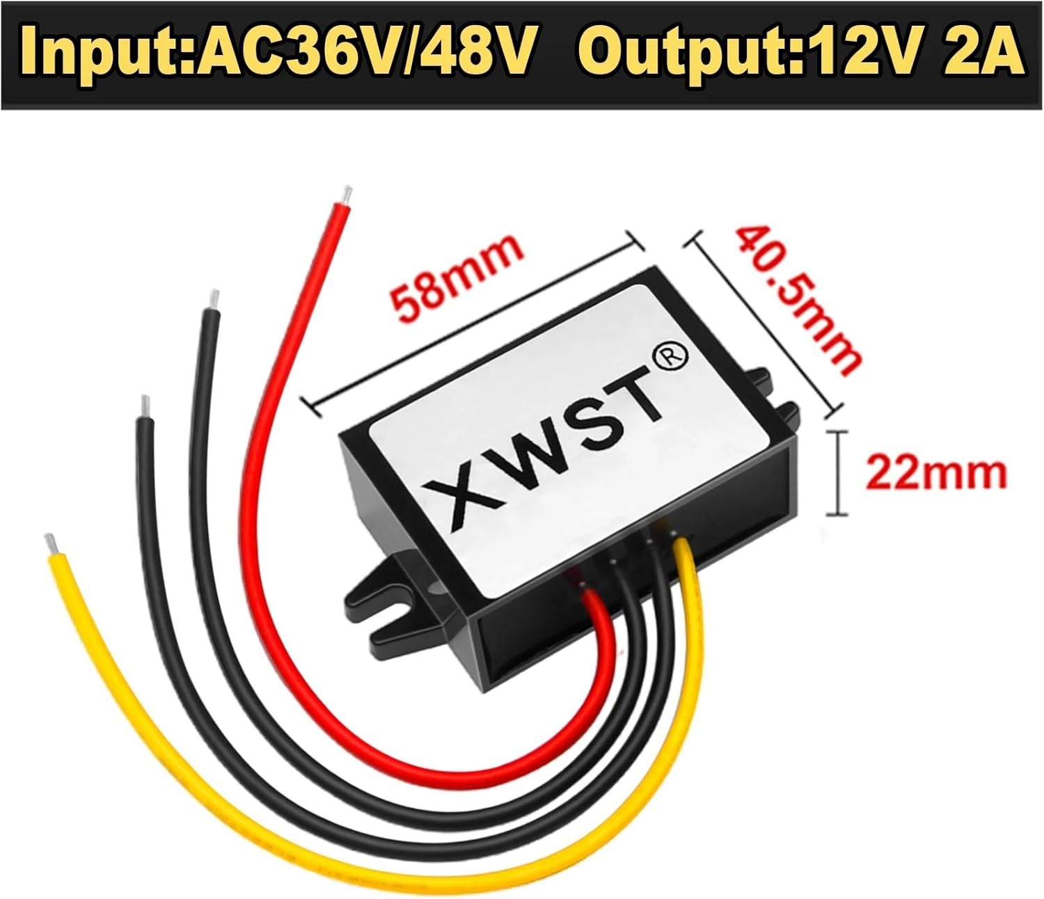 Battery ConvertersPower ConvertersModule Properties:Non-isolated moduleInputVoltage: AC 36V48V DC36V48VInputVoltage Range: AC(22-56V) DC(15-78V)Output Voltage: DC 12VOutput Current:1-3AOutput Power:12W-36WConversion Efficiency: >93%Cable Length: 13-14cmRipple (Full load test): 40mVNo-loadcurrent: 25mAWorking Temperature: -40~80Product size:ABS Plastic M(1-3A) 46*32*18MM 58g/pcs