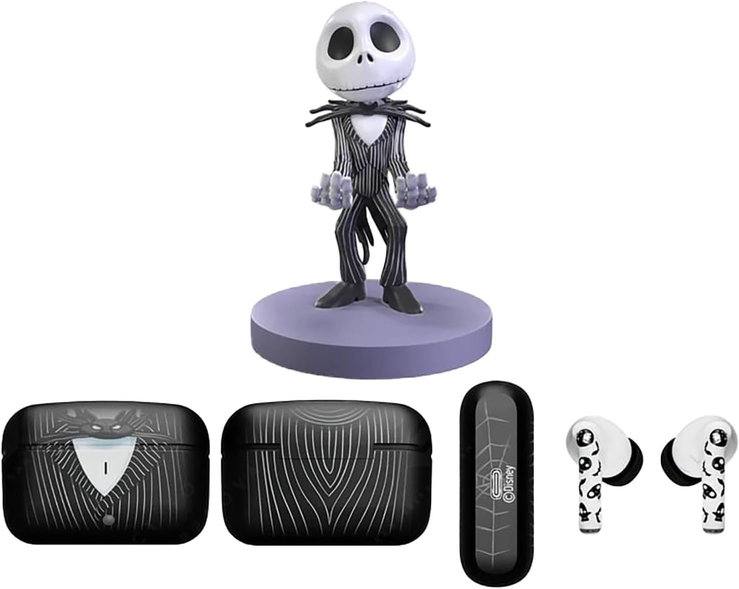 Exquisite Gaming Nightmare Before Christmas Earbuds Bundle: Introducing the official Jack Skellington Buds Pro and Holdem collectible set, where fandom meets function. This thoughtfully designed bundle features premium wireless Bluetooth earbuds paired with a meticulously crafted character figure that holds your devices with purpose. Collectible Holdem Figure: The four-inch tall Jack Skellington figure stands as a decorative tech accessory and practical holder for your earbuds or phone. Crafted from heavy-duty PVC with authentic character design details, it combines the whimsical Tim Burton aesthetic with everyday functionality. Perfect for desktop setups, dorm rooms, or office spaces where fellow TNBC fans will notice. Premium Wireless Earbuds: These officially licensed earbuds deliver HD stereo sound with 32 ohm impedance and 110 dB sensitivity for rich, clear audio during music listening and calls. Bluetooth 5.3 technology provides reliable connectivity up to 33 feet with the ability to connect two devices simultaneously. The ergonomic in-ear design includes multiple ear tip sizes for a comfortable fit during extended wear. Battery and Charging: Each earbud charge provides four to five hours of continuous playtime, while the decorative Jack Skellington charging case holds 500 mAh capacity for seven to eight additional recharges, totaling over 28 hours of playtime. Both Type-C wired and wireless charging options are supported for convenient power management. Audio Features: Advanced noise reduction technology operates at 24-26 dB depth across 50-800 Hz frequency range, ensuring clear calls with minimized background interference. The clear microphone with -42 dB impedance rating captures your voice effectively during phone conversations and video calls.
