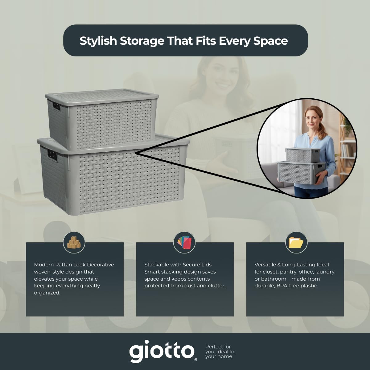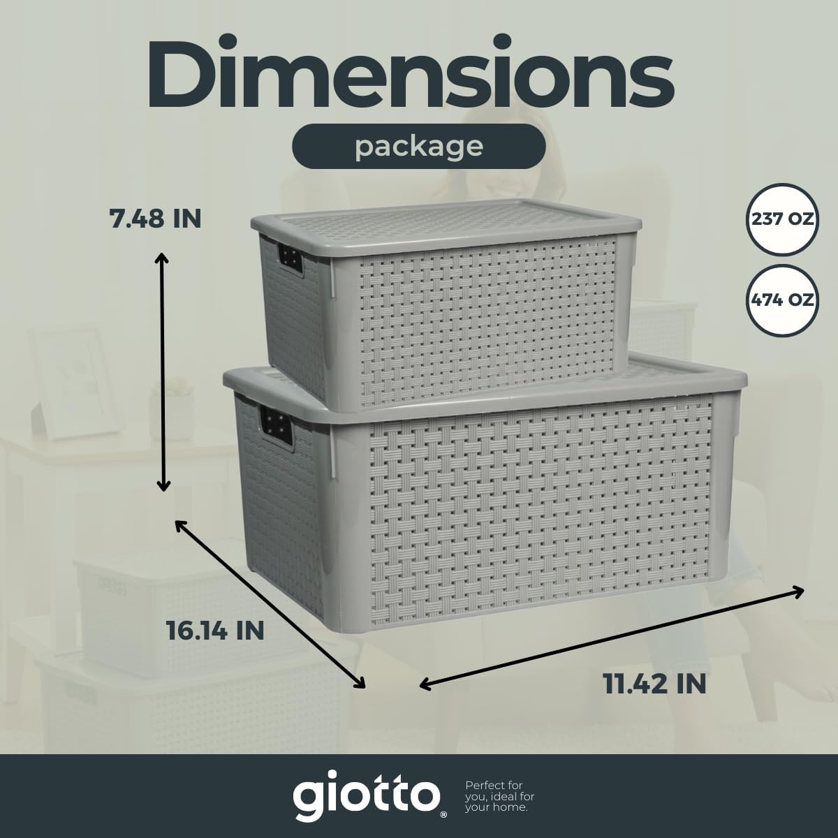 Keep your home organized in style with the Giotto HomeBox Rattan Storage Box Set. This set includes two versatile organizer bins – one 7L (237oz) and one 14L (474oz) – designed with a modern rattan pattern that combines functionality with a decorative touch. Perfect for storing everyday essentials, these stackable bins with secure lids are ideal for use in the closet, pantry, office, laundry room, or bathroom. Their durable, high-quality plastic construction ensures long-lasting use, while the ventilated woven design allows airflow to keep contents fresh. Whether you’re organizing clothing, toiletries, cleaning supplies, snacks, or stationery, these bins help reduce clutter while complementing any décor. Lightweight yet sturdy, they’re easy to carry, stack, and store.