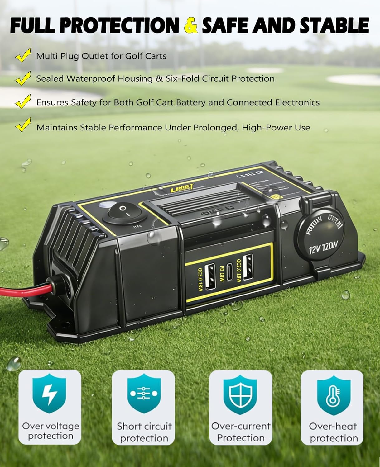 Upgraded Your Golf Cart! All-in-One Charging & Power Hub, Stay connected and powered on the course with our versatile Golf Cart Power Outlet. Engineered specifically for golf enthusiasts, this compact adapter turns your cart into a mobile charging station and high-power source.All-in-One Charging Ports – Equipped with 1× 12V-120W cigarette lighter socket, 2× 18W QC3.0 USB-A ports, and 1× 18W USB-C port, it lets you simultaneously charge phones, tablets, GPS devices, Bluetooth speakers, and more—no more battery anxiety on long rounds.High-Power XT60 Outputs – Two XT60 connectors deliver up to 400W continuous power (600W peak), perfect for golf cart heaters, drones or other high-demand accessories. Plug and play—no electrical modifications needed.Easy & Secure Installation – No drilling required. Simply attach with the included heavy-duty waterproof adhesive pad. Compatible with 36V/48V carts like Club Car, EZGO, and Yamaha (30–60V DC input).Built Safe & Tough Waterproof– Featuring six-layer protection (over-voltage, current, load, short-circuit, under-voltage, and temperature), it ensures reliable performance. high‑quality housing is both waterproof and dust‑resistant.Includes clear manual and video guide. Rest assured—if you have any questions, we're here to help and will make it right for you.