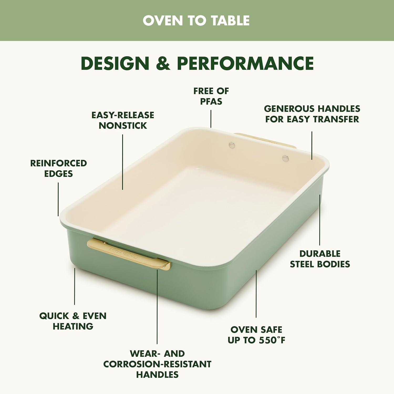 Built from ultra-durable aluminized steel, the collection delivers unmatched strength and outstanding oven performance. Designed to handle everything from lasagnas and casseroles to sticky baked goods like cinnamon rolls, this cake pan is deep enough for generous portions and perfect for oven-to-table service. The PFAS-free nonstick coating ensures smooth food release and healthier results, while the heavy-gauge construction holds up for years of delicious meals. Transform your oven cooking with the collection – where elegance meets endurance.