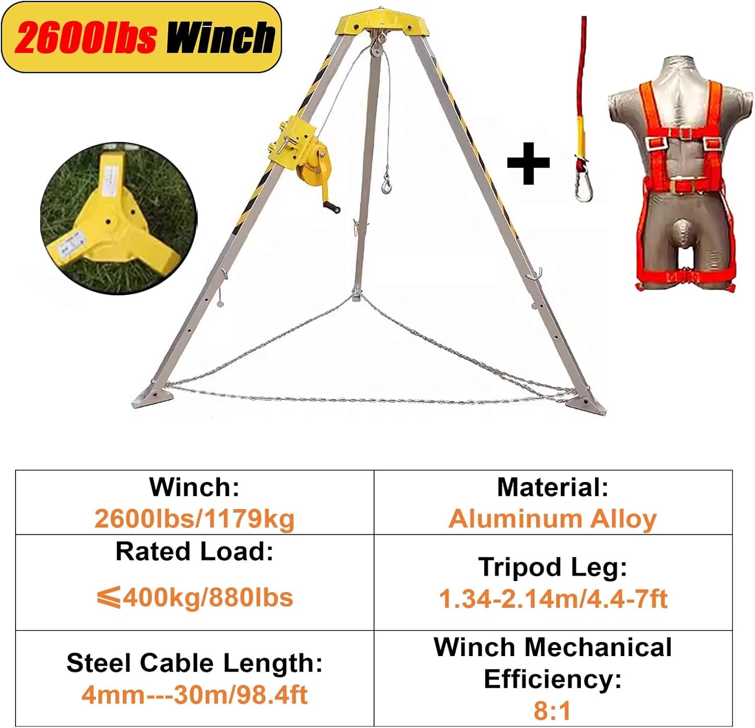 Emergency Firefighting Rescue Rope System: Are you concerned about safety while working in high places, on cliffs, or in confined spaces? Our Confined Space Rescue Tripod is designed to address these challenges effectively. In critical situations, this tripod rescue system enhances the efficiency of rescue operations, ensuring the safety of individuals in distress. Key Features: - Adjustable Angle Feet: Easily install the tripod in various environments, including wells and pits, regardless of ground unevenness. - Durable Winch: Designed for lifting, lowering, and positioning personnel and materials in confined spaces, our winch offers reliable performance. - Lightweight and Foldable: The tripod is portable, making it convenient to store and transport to different rescue sites. - Safety Chain: Provides additional support for high-demand applications, enhancing overall stability. - Telescopic Support Legs: Adjustable height allows for customization based on specific working conditions. - Versatile Applications: Ideal for use in firefighting, municipal services, and rescue operations. - Fall Protector: Offers double protection for users, adding an extra layer of safety. - Ring Protection Chain: Prevents slipping or movement during use, ensuring secure operation. - Heavy-Duty Aluminum Alloy: Constructed from robust materials for durability and long-term reliability. Specifications: - Material: Aluminum Alloy - Wire Cable Length: Available in 20m/66ft or 30m/98ft - Adjustable Height: 1.34-2.14m/4.4-7ft - Winch Efficiency: Options of 5:1 or 8:1 - Rated Load: - 1200LBS winch safe load: 200KG/440LBS - 1800LBS winch safe load: 300KG/660LBS - 2600LBS winch safe load: 400KG/880LBS Package Includes: 1 x Rescue Tripod Kit (includes winch, cable, safety belt). Note: Minor variations may occur due to different batches and manual measurements. Thank you for your und...