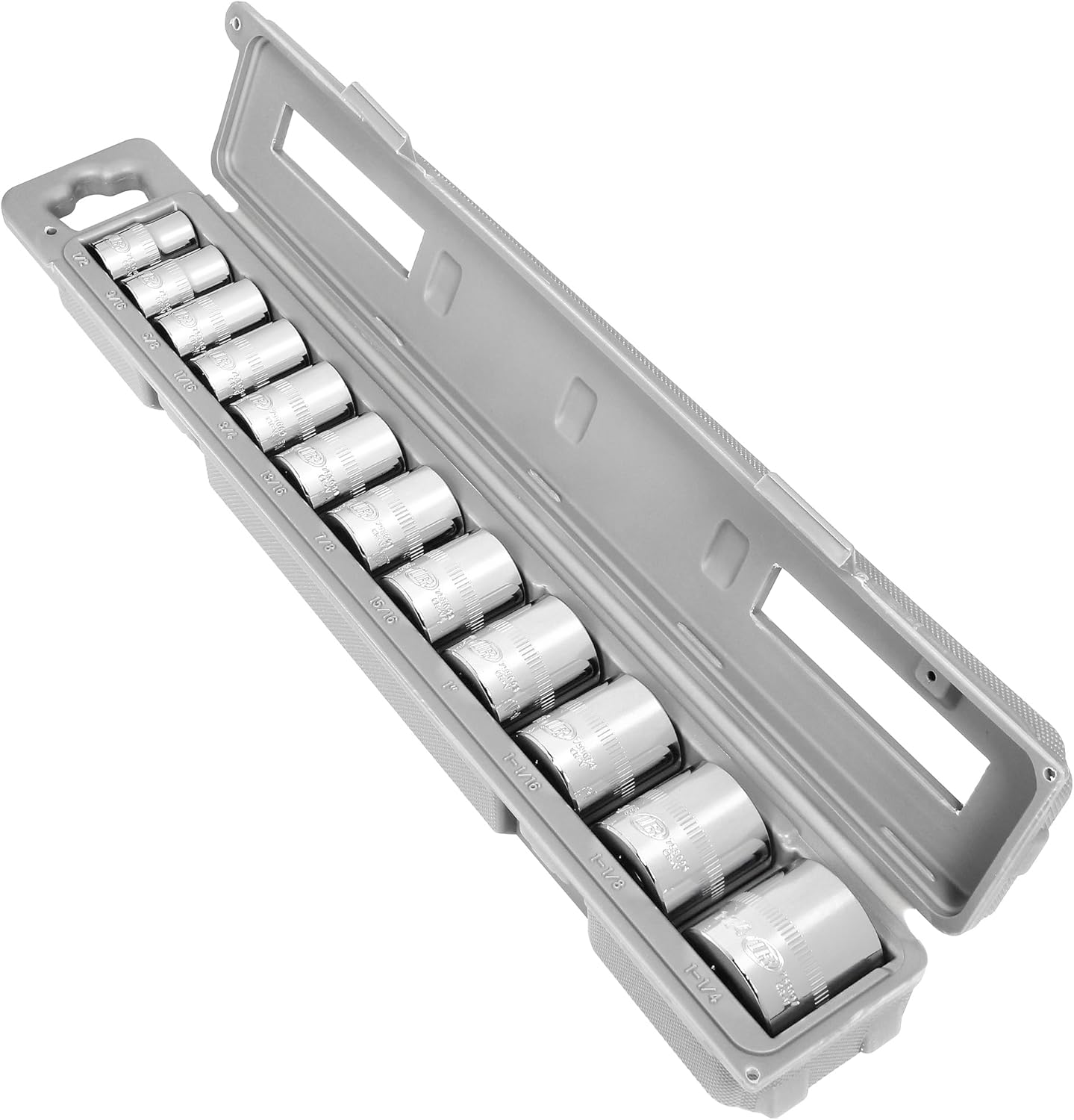 Ingersoll Rand 6-point deep sockets are constructed of industrial-grade Chrome Vanadium steel that exceeds ANSI standards. Each socket is finished with mirror-polished chrome plating. Ingersoll Rand signature vertical knurling offers better grip and easier handling (especially with greasy hands). The set includes a heavy-duty storage case with snap closures and a hang tab for pegboard storage