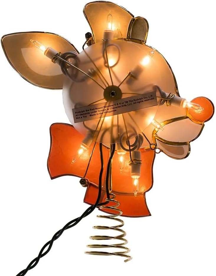 Add the perfect finishing touch to your Christmas tree with this 7-inch Rudolph lighted capiz treetop from Kurt Adler. Perfect for fans of Rudolph the red-nosed reindeer, this treetop features Rudolph's smiling face and bright red nose in capiz with a brass plated finish. This treetop comes with 4 spare bulbs and 2 spare fuses