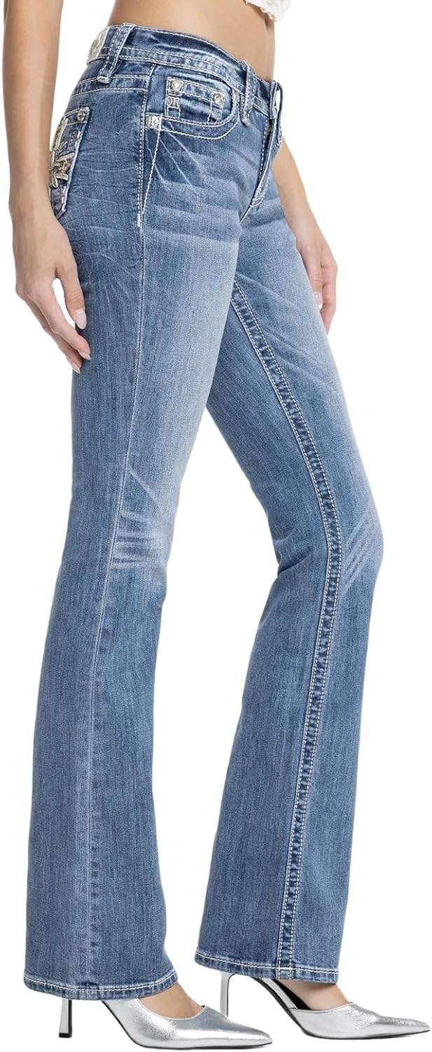 The Miss Me Women's Elora Cross Embellished Pockets Mid-Rise Bootcut Jeans offer the perfect blend of classic denim style and eye-catching detail. Featuring a rich dark wash with subtle fading, these jeans create a flattering, elongated silhouette that complements any outfit. The standout feature is the intricate cross embroidery on the back pockets, adorned with metallic stitching and rhinestone embellishments for a touch of sparkle. Designed with a timeless bootcut fit, these jeans effortlessly pair with boots or heels, making them a versatile staple for both casual and dressed-up occasions.Crafted from a high-quality stretch denim blend, the Miss Me Women's Elora Cross Embellished Pockets Mid-Rise Bootcut Jeans provide all-day comfort with a flexible fit that moves with you. The mid-rise waist offers just the right amount of support and coverage, ensuring a flattering look for every body type. A classic five-pocket design adds functionality, while Miss Me’s signature attention to detail elevates these jeans beyond the ordinary. Whether you're heading out for a night on the town or a laid-back day with friends, these jeans deliver the perfect mix of elegance, edge, and everyday wearability.