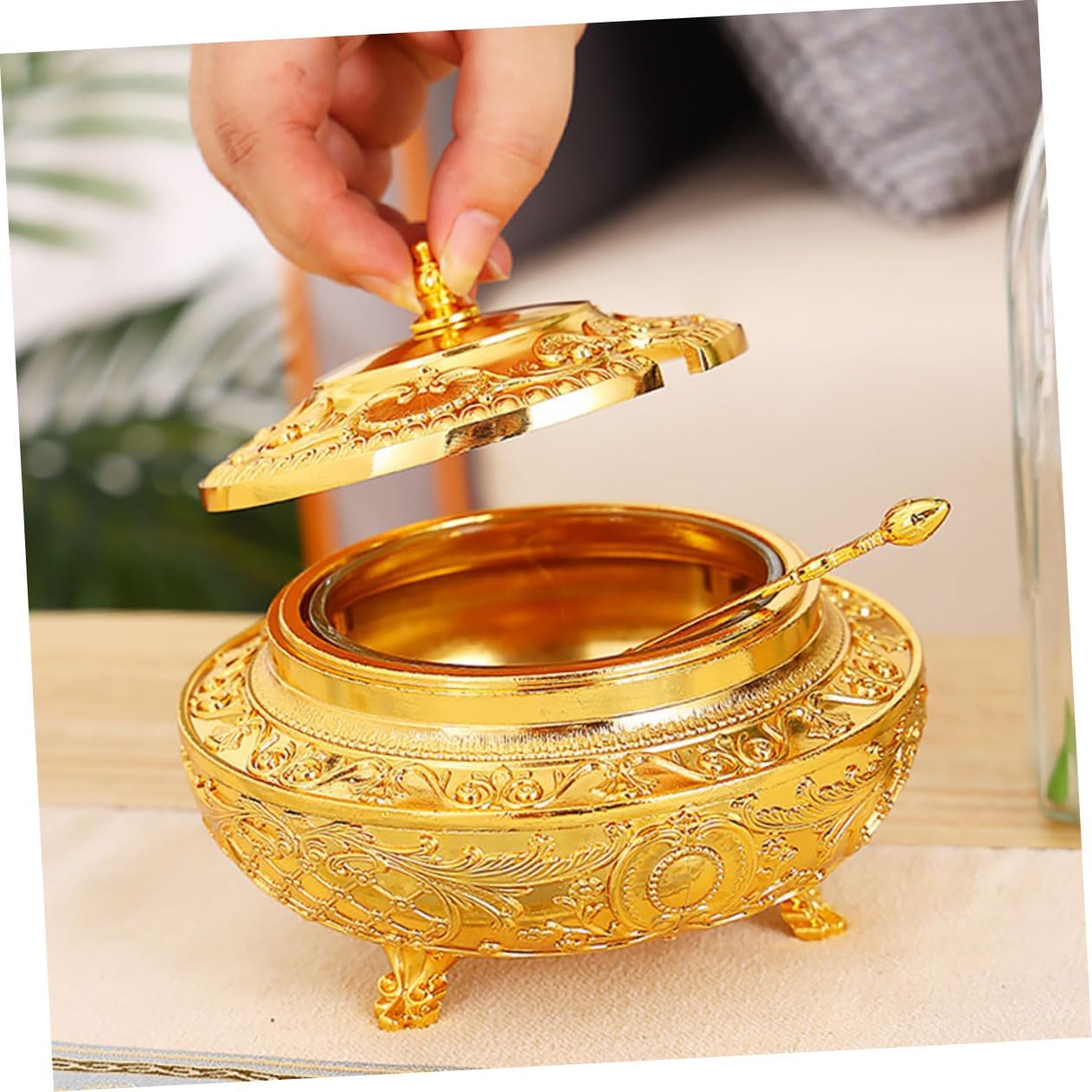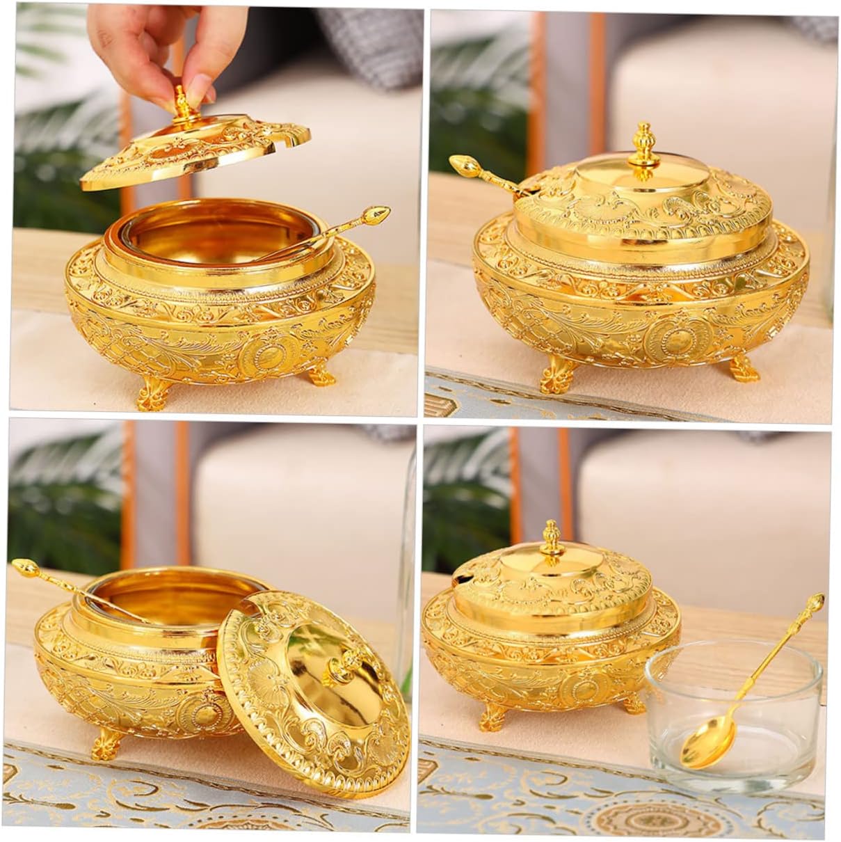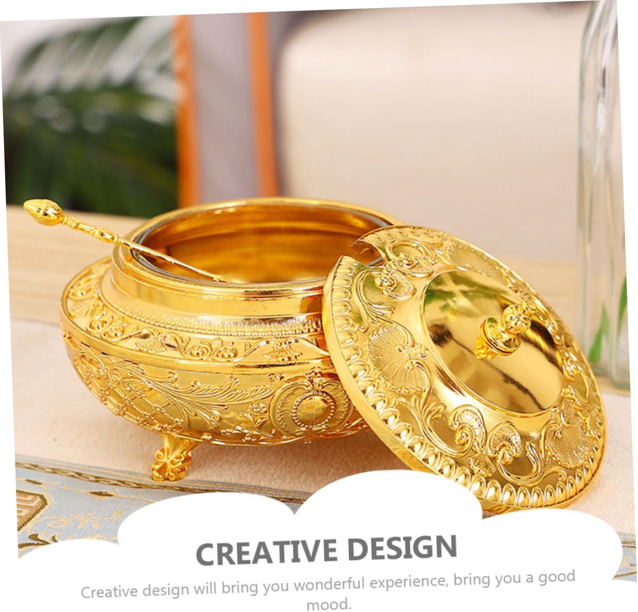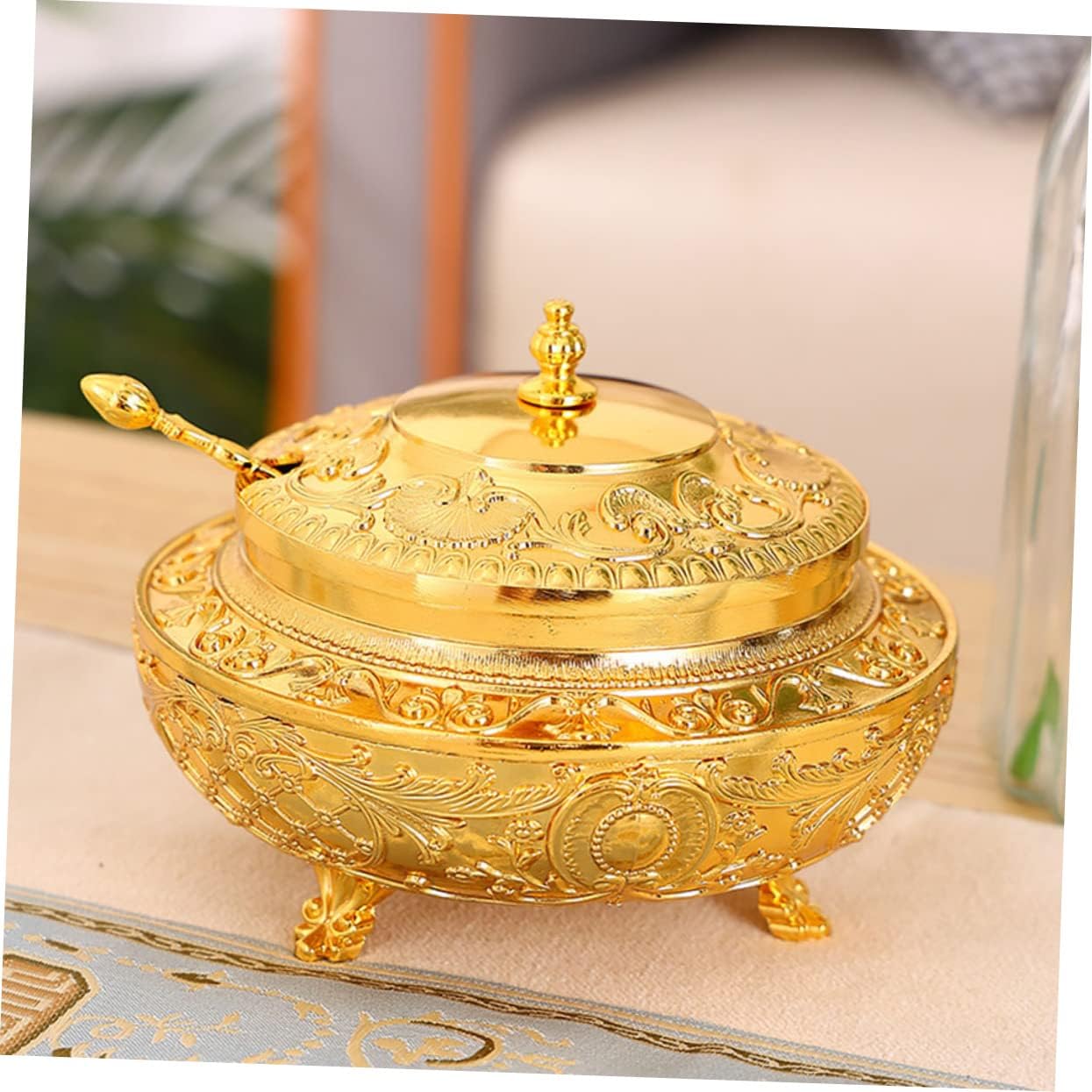 Package Include 1 x Condiment Jar 1 x Spoon Characteristics - Color: Golden European Style Spice Pot - Size: About 14.00X14.00X12.00cm/5.50X5.50X4.72in Alloy Seasoning Pot - Material:Alloy Household Spice Jar - design and unique shape, and elegant, which is a perfect kitchen or dinning table decoration condiment jar with lid. - It is well-made of premium and sturdy materials, safe and practical for using time spice dispenser with spoon. - With the creative and luxurious modeling, it will let you enjoy a high-end life kitchen sealed jar. - Widely applied in home, restaurant, coffee shop, dinning room, hotel, etc European Seasoning Container. - Great for holding tea leaf, chili powder, curry, sugar, salt, and so on European Spice Container.Goods Descriptioncontainer with spoon Also, it is a wonderful housewarming present for your relatives.Household Seasoning Container This product is a seasoning jar.sealing container with spoon The perfect kitchen assistant for home and restaurant.Household Condiment Container It is not only a practical seasoning jar, but also a home decoration