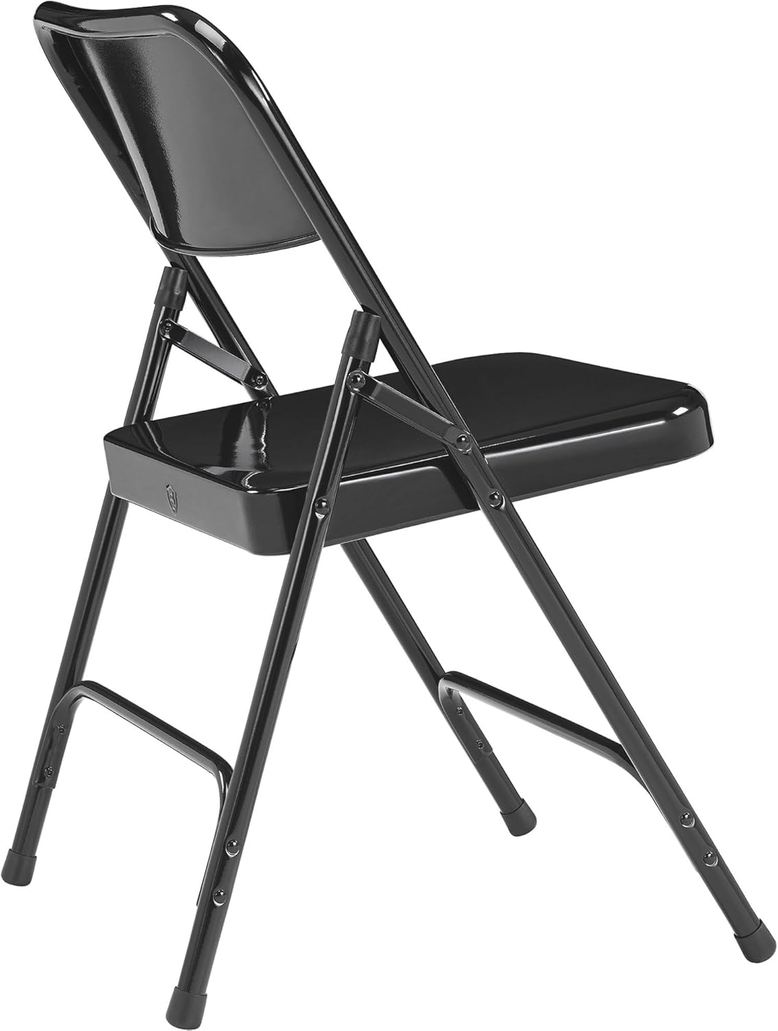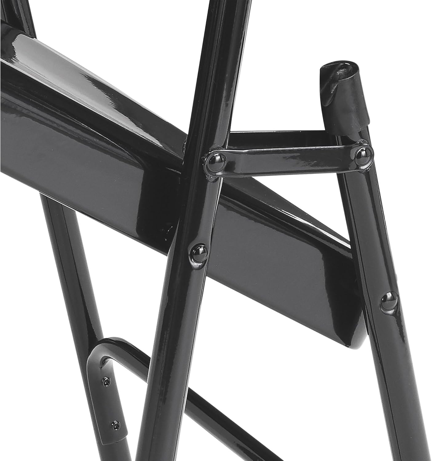 The National Public Seating Folding Chair features an electromagnetically welded steel back and steel seat. Its 18-gauge 7/8in. round tubular frame features double hinges for added stability and durability, two U-shaped double riveted cross braces and a powder-coated finish. Chair also features color coordinated polypropylene glides and V-tip plugs for added stability. Sold in a pack of 24 chairs.