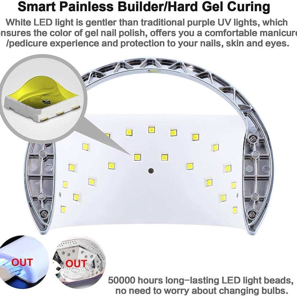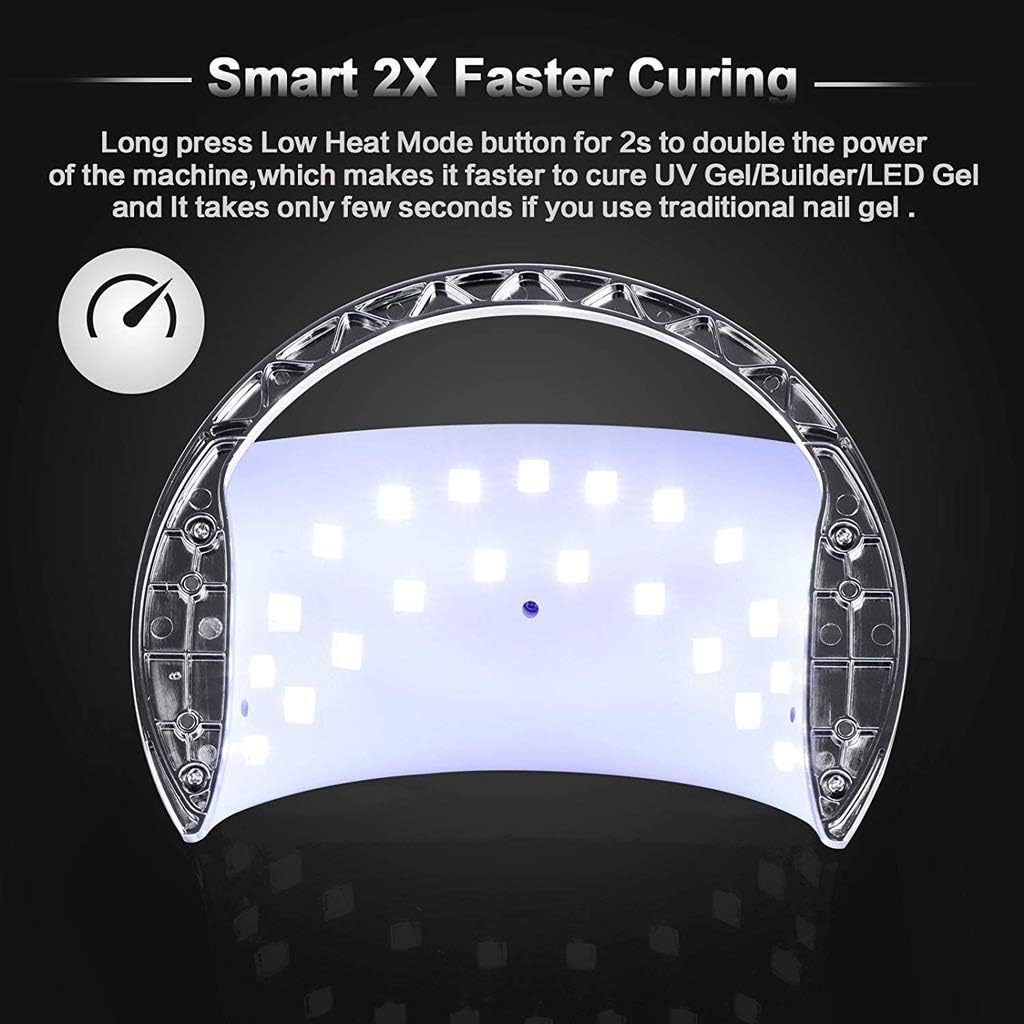--Smart Painless Builder/Hard Gel Curing--Smart Speed Curing--Smart Time Memory Function--Smart Sensor--Smart Digital Time Display--Smart Over-Temperature ProtectionHOW TO USE OUR SUN6 NAIL LAMPOTHER BENEFITS/FEATURES:*designed with removal bottom tray and portable handle, easy to be cleaned, used and carried.* for personal and salon use. *Suitable for curing all kinds of and LED nail gel polishes. * No need to replace any light bulbs. *Cures 5 fingernails or toenails at the same time in many ways. *3 Timer : 30s, 60s, 99s low heat mode*Large LCD screen to show curing time.