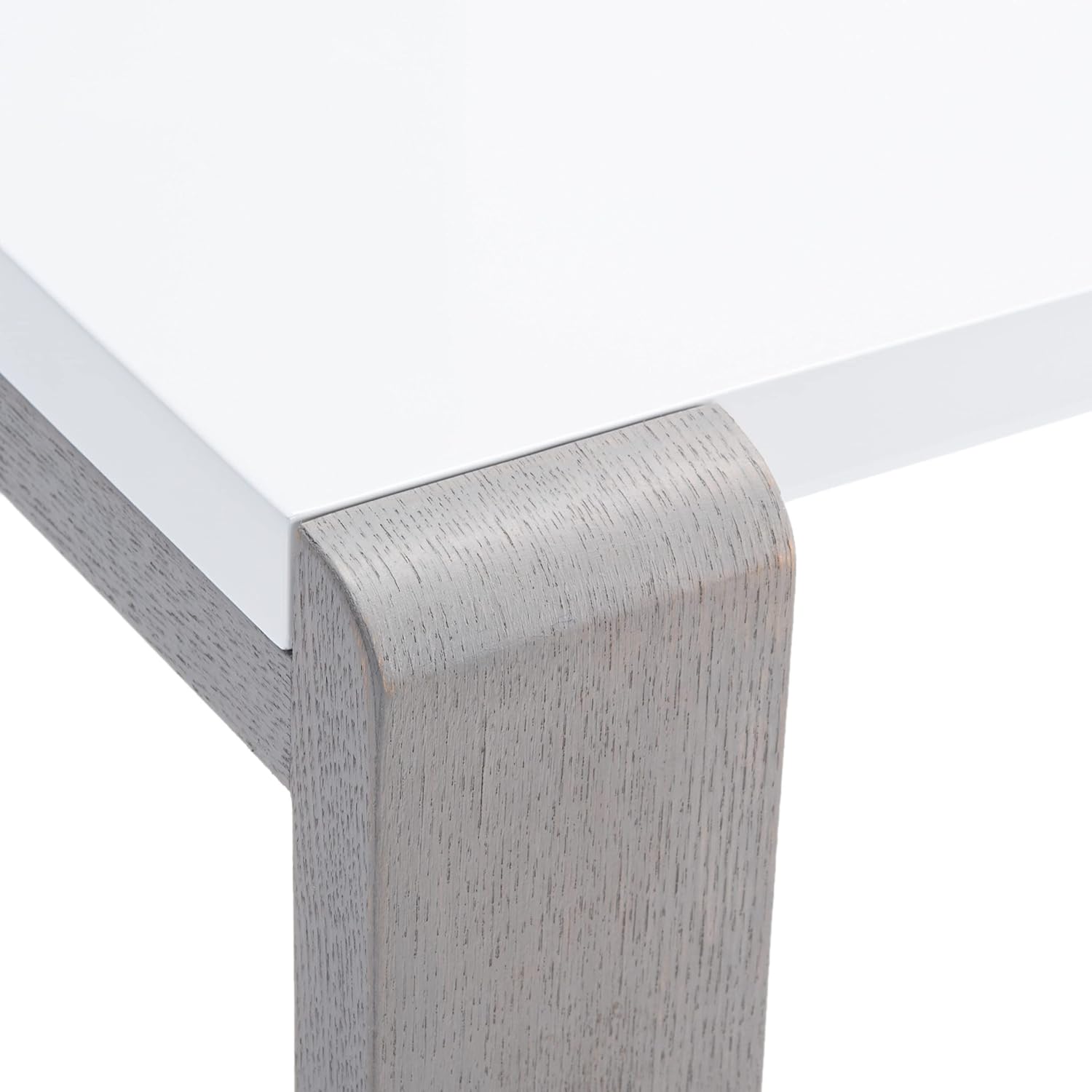 Rugged meets refined in the contemporary Bartholomew console table with white lacquer top and chunky wood grained base in a chic grey-wash finish. Whether set in a penthouse or loft, this dramatic console will command attention in a living room or hall.
