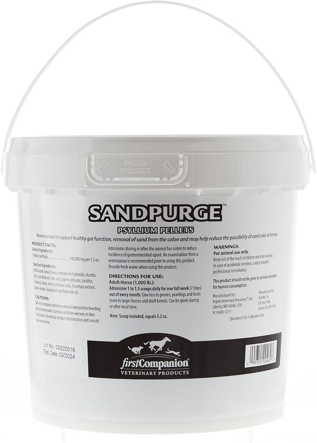 First Companion Veterinary ProductsSandPurge Psyllium PelletsAids in removing sand and dirt from the intestinal tractApple and molasses flavored pellet100% psyllium seed huskCan be used as a top dress or fed separately to reduce gastrointestinal upset and increase gut functionReduce the possibility of sand colic in horses and ponies 5 LB Used to help in the removal of sand and dirt from the intestinal tract of horses. Supports healthy gut function and may help reduce the possibility of sand colic.
