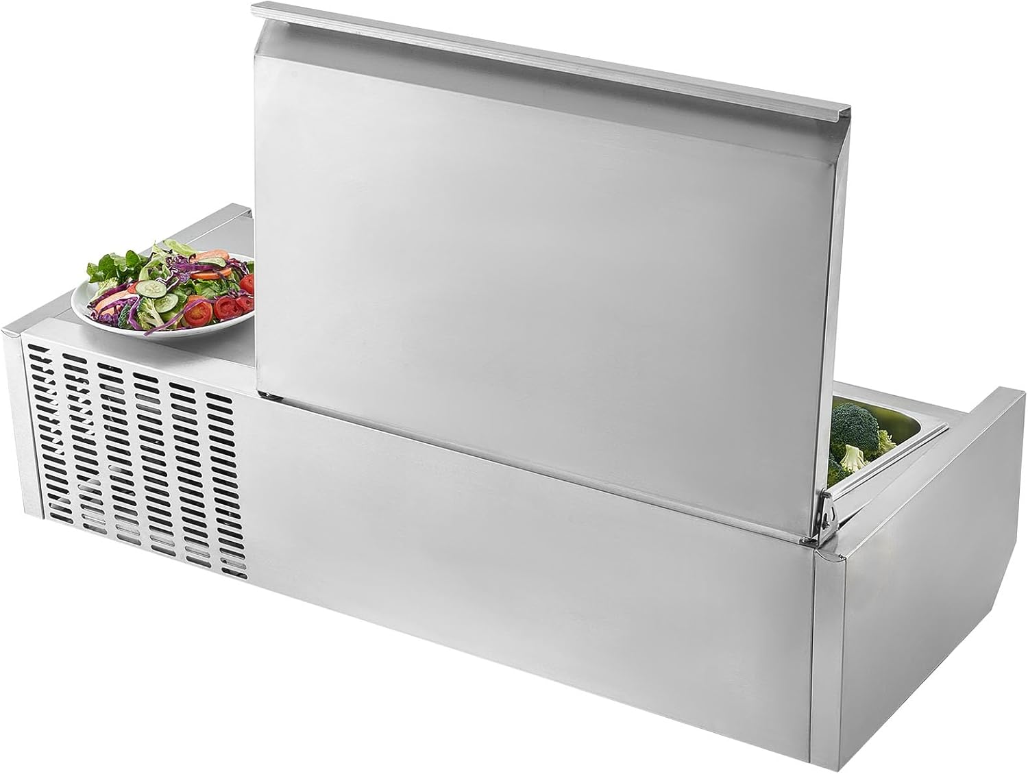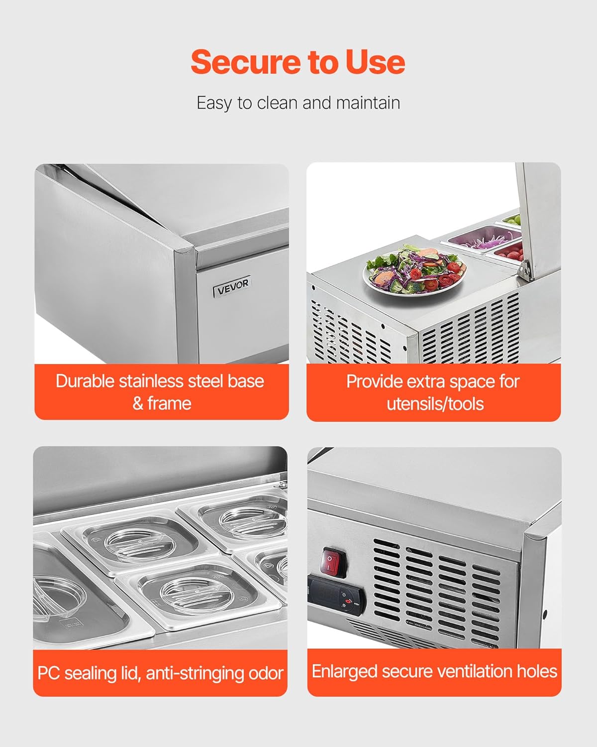 | Item Type Name | 120 W Countertop Refrigerated Condiment Station, with One 1/3 Pan & Four 1/6 Pans, 304 Stainless Body and PC Lid, Sandwich Prep Table with Stainless Guard |