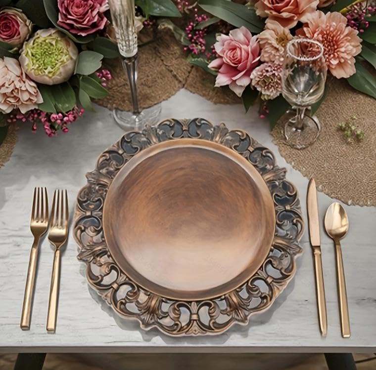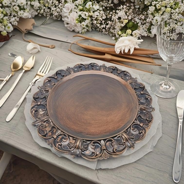 Features: Keep the table clean: The retro charger dinner plate is designed in an embossed shape, full of elegance and chic, easy to attract the attention of others, suitable to be placed under the dinner plate, avoid food spillage, and keep your table clean and tidy. Attractive touch: These charger trays have a classic design that doubles as the base for a bowl. These plates can easily add a touch of elegance to most dining experiences, whether it's to impress your family, friends, or others. Specifications: Material: Plastic Color: Gold Dimensions: Approx. 13 x 13 inches / 33 x 33 cmPackage Includes: 100 x Retro Charger Plate Note: Manual measurement, please allow slight error in size. For easy maintenance, the plastic charger plate can simply be wiped clean with a damp cloth and stored at room temperature. Please do not put our products in the microwave or dishwasher. There may be slight differences in color due to different screen displays.