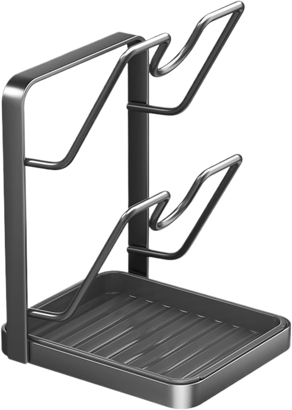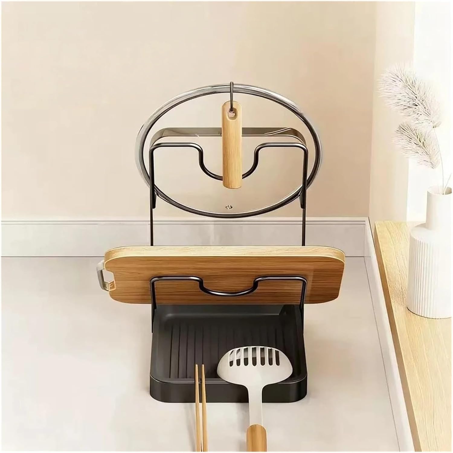 Specifications:*Part Name:Pot Lid Holder *Material:PP+Carbon Steel*Size:18.2x13.6x22.5cm*Color:Grey,WhitePackage Content:1x Pot Lid Holder Material : Plastic