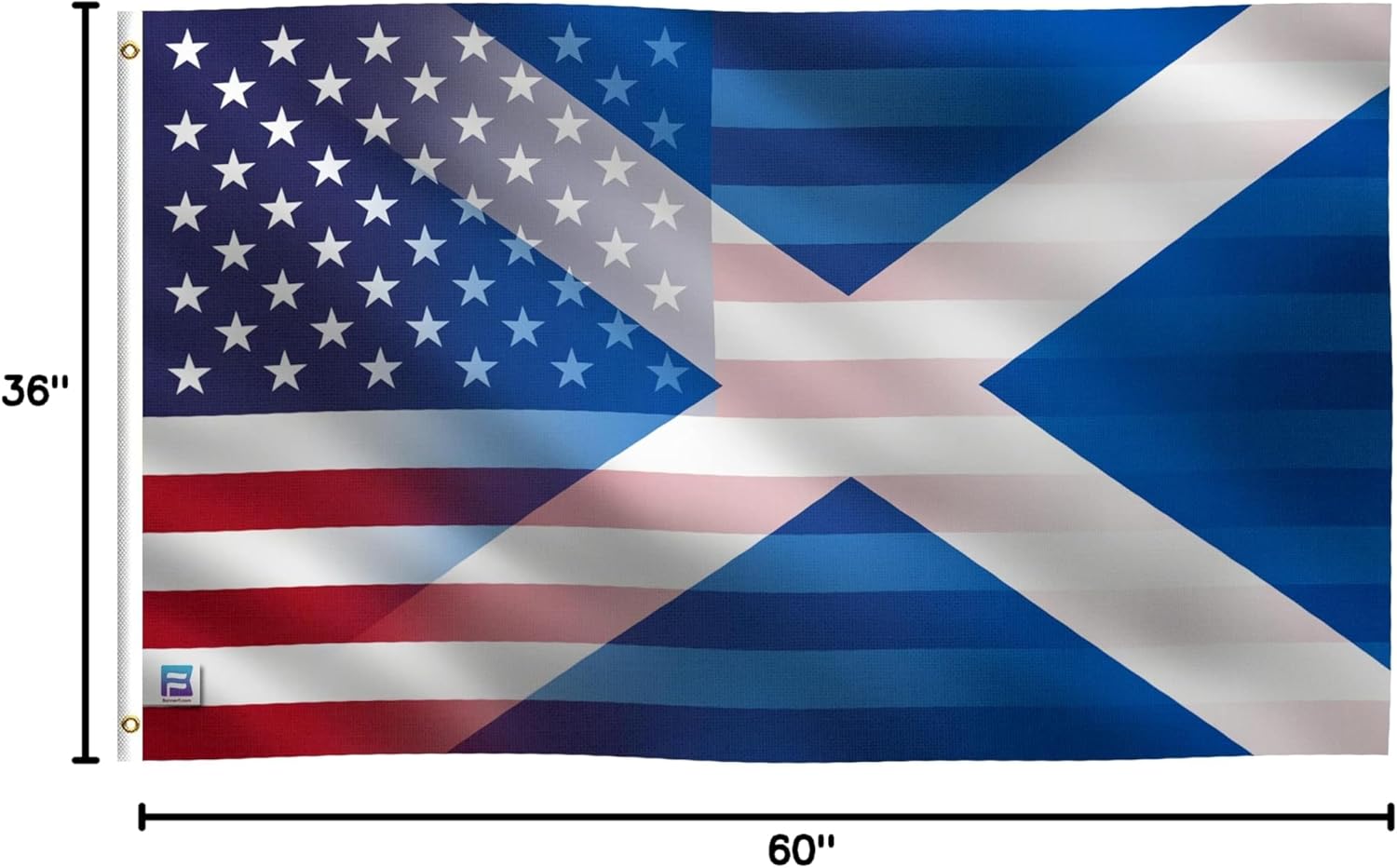 "A new generation of Americans" is the motto that unites the two flags. It was created to unite people from both backgrounds. Whether you're from Scotland or born in America you can show your allegiance with this flag and be proud of it. The design is a hybrid between the American and Scottish flags, with the colors of our country blended together in a unique pattern. Stick it on your wall at home or office or fly it proudly outside. This Scottish American flag makes a great way to show patriotism and nationalism.Specifications:- Material: 100% Polyester- Dimensions: 3 Feet x 5 FeetFeatures: - 100% Polyester- Digitally printed- UV and Weather Resistant - Double Stitched Flags- Brass Grommets