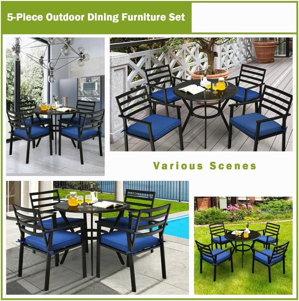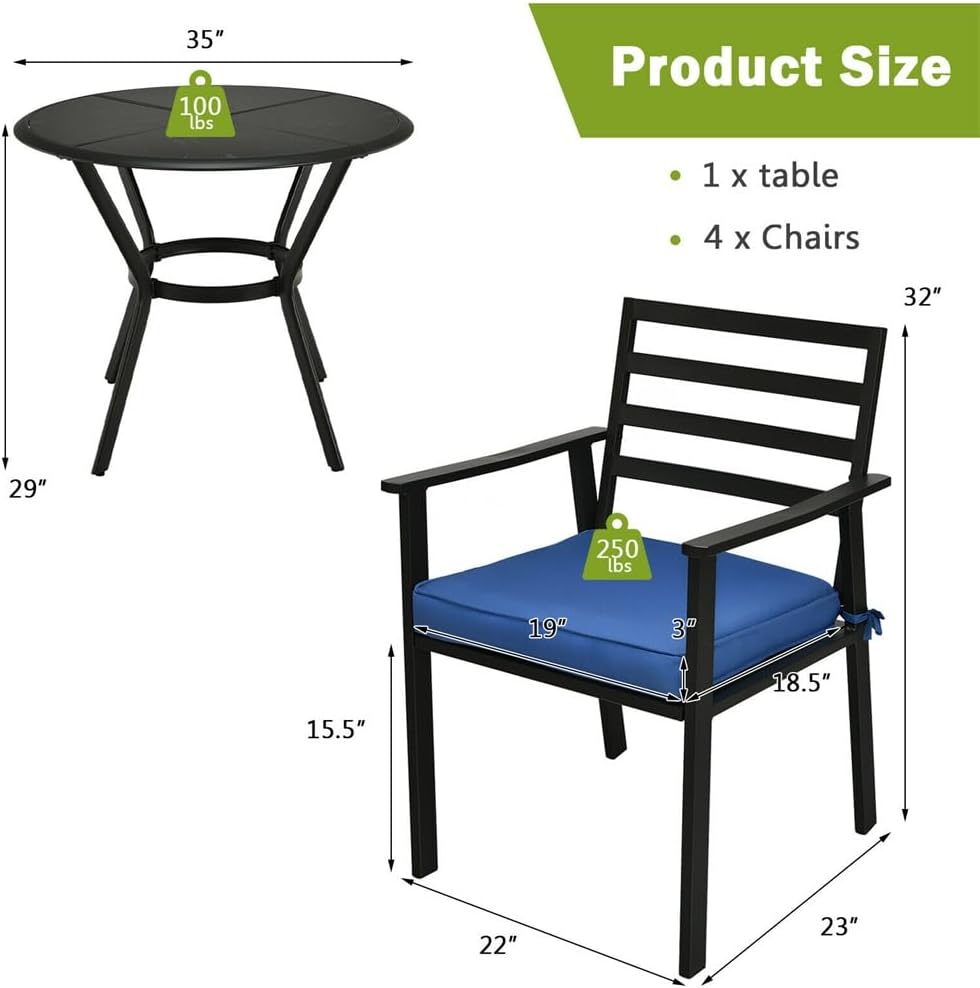 Description:Our outdoor 5-piece dining furniture set is your best choice for adding dining space outdoors. When you sunbathe with your friends or enjoy a delicious dinner with your family, its multifunctional design will provide service. A spacious seat made of iron with coating technology capable of bringing better rust resistance and longer service time.Another key point to say is that each chair features a high-density cushion with ropes, which is cozy and can be easily fixed to the seat. The glass table is smooth which is at the ease of cleaning. The dining table is designed with adjustable foot pads, which play an important role when the ground is uneven.Handrails both sides provide a place for hands to restThe backrest provides strong support for the back to relieve fatigueIncluding all accessories and clear instructions, easy to assembleSpecifications:Color: Black, Material: Iron + SpongeChair Product Dimension: 22" x 23" x 32" (L x W x H)Table Product Dimension: 35" x 29" (Dia. x H)Seat Size: 19" x 18.5" (L x W)Net Weight: 88 lbsChair Weight Capacity: 250lbsTable Weight Capacity: 100lbsPackage Includes:1 x Outdoor Dining Table4 x Outdoor Dining Chairs4 x Cushions1 x User Manual(no other presentation items included).Notice:1. Due to manual measurement, please allow 2-3% error, before you bid, please make sure you don't mind.2. The color may vary due to different displays, please refer to the actual product.