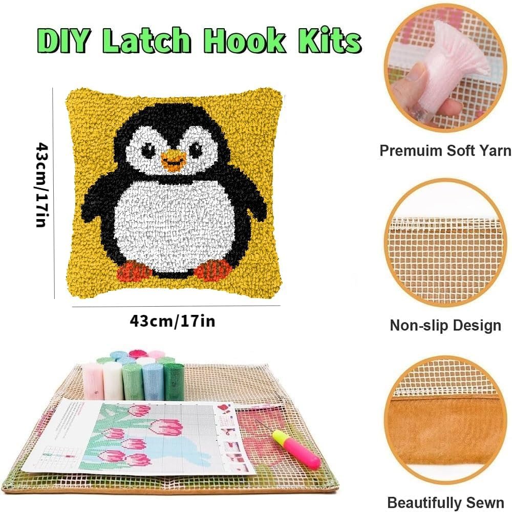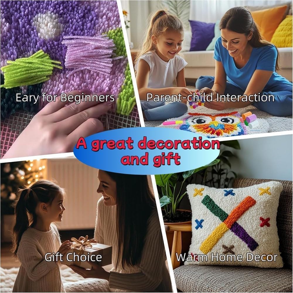 Amcdjkery Latch Hook Pillow Kits:Create,Connect,DecorateHigh-Quality Latch Hook Pre Printed CanvasCraft easily with our lasting,beginner-friendly latch hook kits,featuring pre-printed,precision-edged canvases designed for beginner guidancePremium Soft Pre-cut Pre-sorted YarnCreate with confidence using our yarn latch hook pillow kit,featuring premium, neatly cut soft yarns that ensure both exceptional quality and attractiveness(10% extra yarn)Colorful Latch Hook PillowUnleash your creativity with our beautifully designed crochet starter kit, featuring vibrant and eye-catching colors to make every project a masterpieceAdd a touch of elegance to your living space with our beautifull latch hook pillow kits – a perfect blend of comfort and style!Upgrade your decor with our plush latch hook pillow kits – perfect for cozying up on the bed or sofa!1.How long does it take to complete a project using this latch hook kit?It could take around 2 - 3 hours for an experienced crafter. Beginners might take a bit longer, perhaps 4 - 6 hours.2.Can I wash the finished latch - hooked item?It's best to spot - clean the finished latch - hooked item. Gently dab the soiled area with a mild detergent and a damp cloth.Step Description1.Place crochet hook in mesh2.Put yarn in hook3.Thread yarn through mesh4.Close the crochet5.Crochet put it back and pulled of the yarn