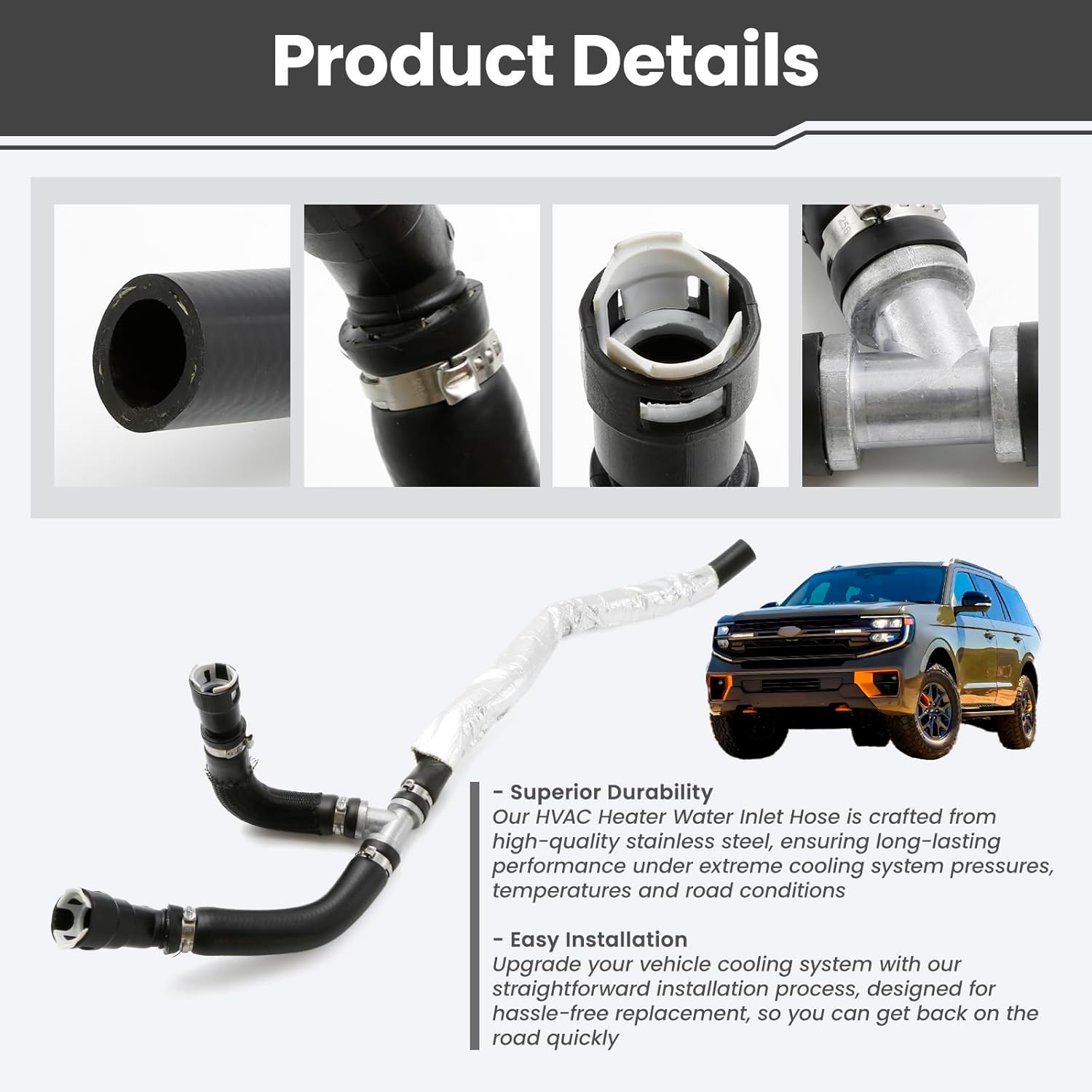 HVAC Heater Water Inlet HoseApplicable Models:Compatible with Ford Expedition 3.5L V6 2018 2019 2020 2021Compatible with Lincoln Navigator 3.5L V6 2018 2019 2020 2021 2022Replace Part Number:Replace JL1Z-18472-B JL1Z18472B JL1Z18472-BProduct Features:- Superior DurabilityOur HVAC Heater Water Inlet Hose is crafted from high-quality stainless steel, ensuring long-lasting performance under extreme cooling system pressures, temperatures and road conditions- Easy InstallationUpgrade your vehicle cooling system with our straightforward installation process, designed for hassle-free replacement, so you can get back on the road quicklyProduct Function:Experience peace of mind with our stainless steel heater hose junction, designed to replace fragile plastic counterparts and eliminate the risk of sudden coolant blowouts that can lead to engine failurePackage Contains:1* HVAC Heater Water Inlet Hose (As shown in picture)