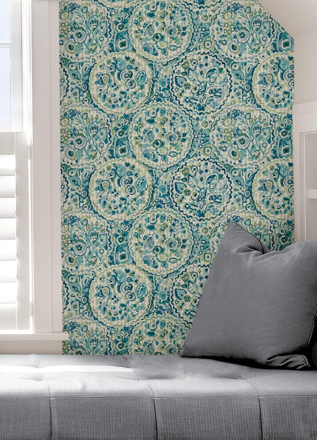 Invite the beauty of nature and artistic flair into your home with this floral peel and stick wallpaper. Hand-painted by the talented Parisian artists, Caroline et Bettina, this teal medallion design is simply a must-have for our boho-chic decorators. Teal Camille Peel and Stick Wallpaper comes on one roll that measures 20.5 inches wide by 18 feet long.