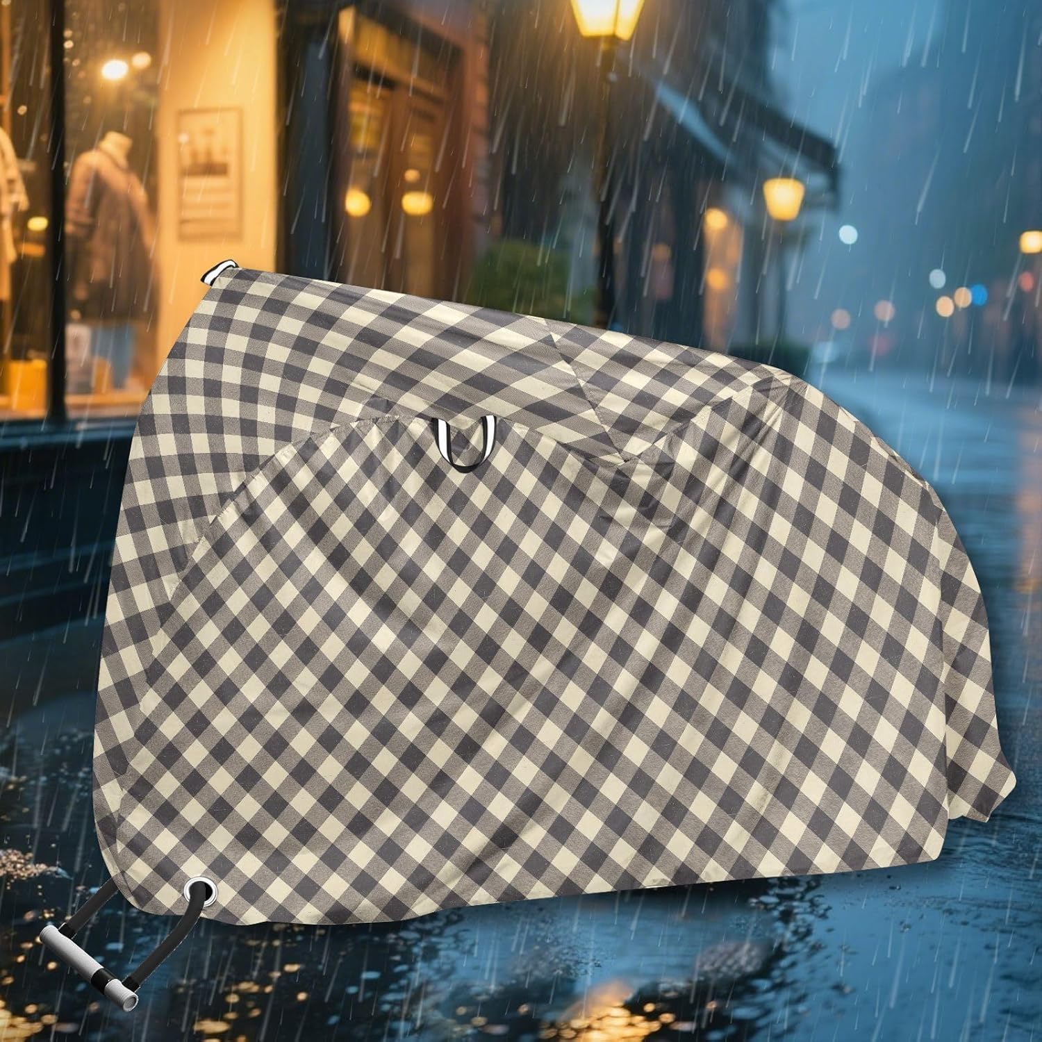 Size: 69 x 42 x 21.6 inches. Bike Cover Outdoor is suitable for various types of bikes, including road bikes, electric bikes, and mountain bikes. Before purchasing, please be sure to measure the length, width, and height of the first to avoid buying the wrong size.Material: Umbrella waterproof fabric. Made of umbrella waterproof fabric, Bike Cover is sun-proof, dust-proof, and water-repellent.Product Function: This Bike Cover Outdoor can prevent rainwater from wetting the bike body on rainy days, and block direct ultraviolet rays, providing shading, heat insulation, and protection against rain and snow weather.Product Design: There is a reserved lock hole at the front wheel position, which can facilitate locking the vehicle. Outdoor Bike Cover are buckles at the rear wheel position to secure the cover and prevent it from moving.Outdoor Accessories: This Bike Cover Outdoor provides a protective guarantee for your beloved car and is an essential accessory for outdoor camping.