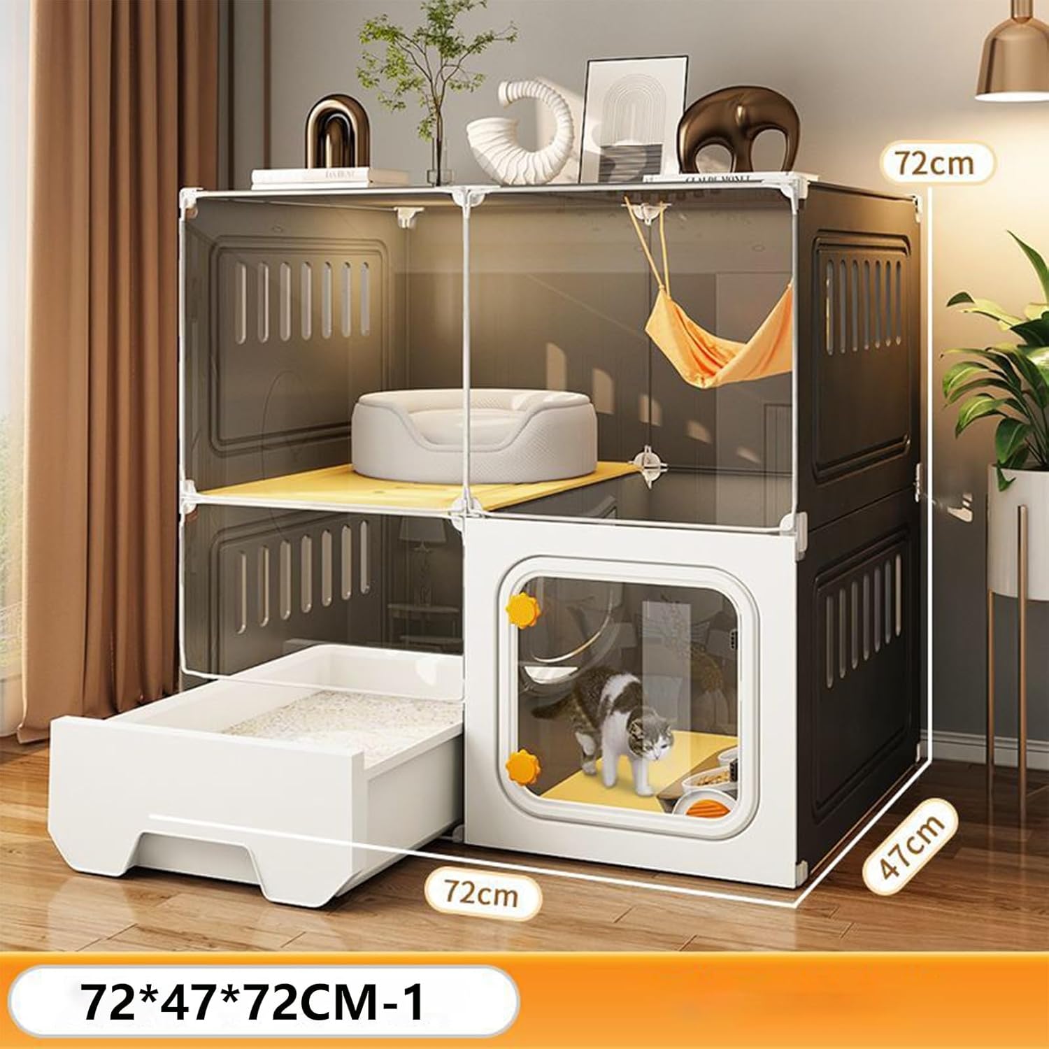 Introducing the Cat Cage Indoor with Cat Litter Box - the perfect solution for all cat owners seeking a comfortable and stress-free environment for their beloved feline friends. This innovative and thoughtfully designed cat cage offers a range of features that will enhance both your cat's well-being and your home's cleanliness. Crafted using an advanced injection molding process, this cat cage is built to be more solid than other assembled types of cat cages on the market. We understand that your cat's protection and security are of utmost importance, which is why this cat cage has been constructed with high-quality materials to ensure its long-lasting durability. Product name: DIY Cat Cage Material: PP+ Iron Size: (The size is as shown in the picture) 72*37*72CM , 72*47*72CM , 72*47*72CM-1 , 72*47*107CM , 72*47*107CM-1 , 107*47*72CM , 107*47*72CM-1 , 107*47*107CM , 107*47*107CM-1 Package A: Cat litter box, cat litter scoop Package B: Cat litter box, cat litter scoop, ladder, cat nest, cat bowl Assembly required: Yes Package includes: Cat cage*1 Package A/B*1 Please note: 1. While we display the most accurate color possible, there are likely to be variations in color due to differences in computer monitors. 2. Manual measurement, the size of the product will be 1-3 cm error.