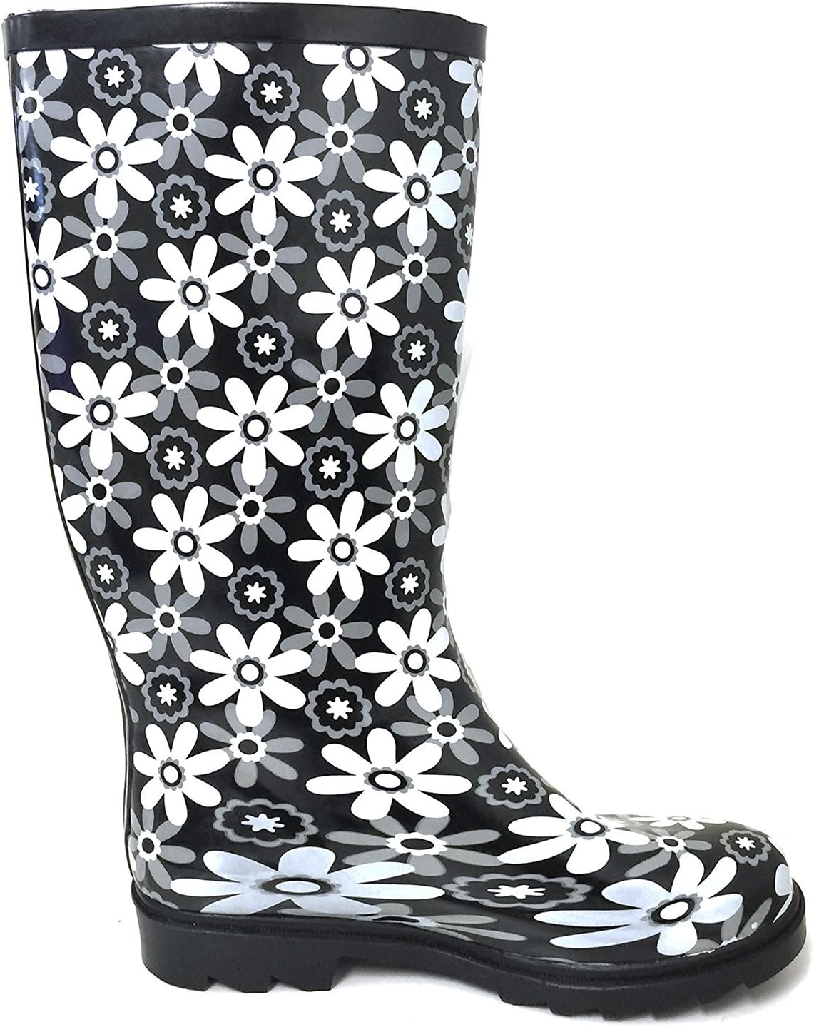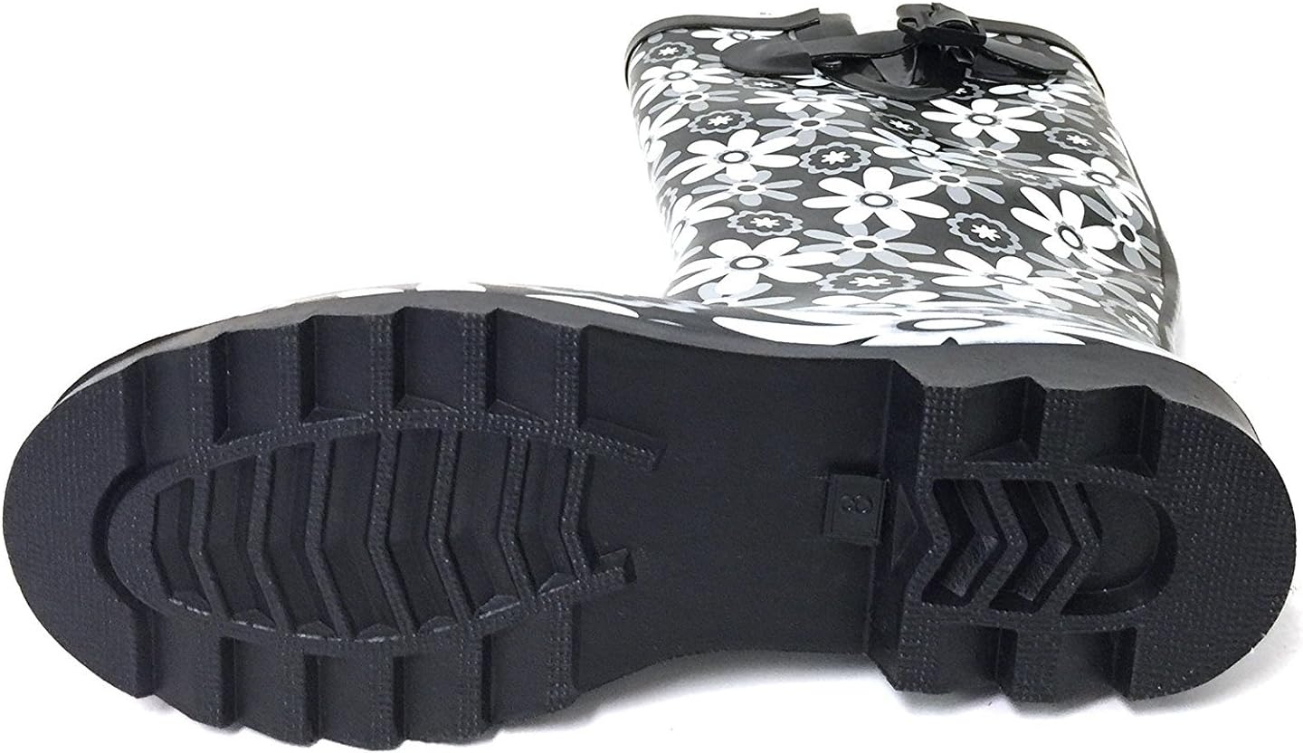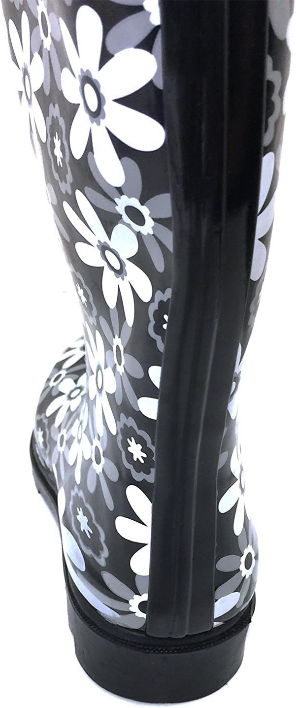 These knee-high rain boots are made of quality durable rubber materials to keep your feet dry and warm. Feature adjustable side buckle strap, cotton fabric lined and removable insole. These rain boots have a 1 inch heel and 13 inch shaft height. Water resistant. Good for all weather conditions