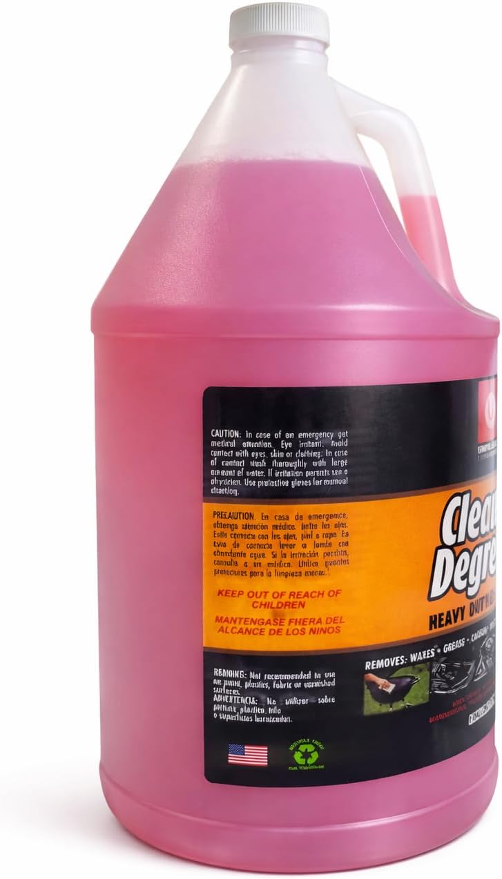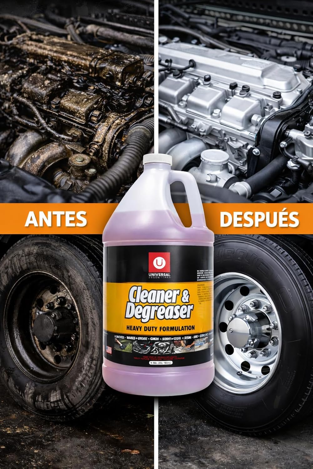 Universal Essentials Heavy Duty Cleaner & Degreaser is an industrial-strength cleaning solution ready to tackle the toughest grease, oil, carbon, soot, gum, resin, wax, and scum buildup. Specially formulated with non-ionic surfactants, this powerful degreaser penetrates deep into stubborn residues, dissolving them quickly and effectively. Ideal for a wide range of applications including kitchen equipment, engines, grills, floors, and industrial surfaces, this versatile cleaner handles both commercial and residential cleaning tasks with ease. Each 1-gallon (128 fl oz) bottle is made in the USA and comes ready to use straight out of the container — no mixing required. Compatible with stainless steel, sealed concrete, ceramic tile, and most hard washable surfaces. Not recommended for use on paint, plastics, fabric, or unfinished surfaces. Keep out of reach of children. Use protective gloves during manual cleaning. If eye or skin contact occurs, flush thoroughly with water and seek medical attention if irritation persists.