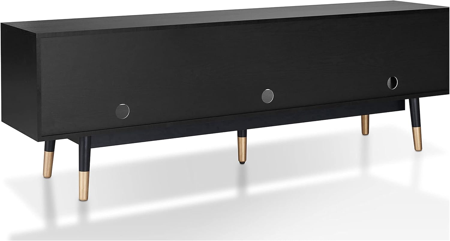 Rich wood tones are paired with a retro silhouette in the Pough Black Wood TV stand. Constructed from Particleboard and MDF Materials, the Pough displays an elegant walnut brown finish that complements any color scheme. 3-open shelves and 3-drawers provide space to place DVD players, game consoles, and more. Enjoy the allure of this retro-inspired TV stand and add excellent style to your space.