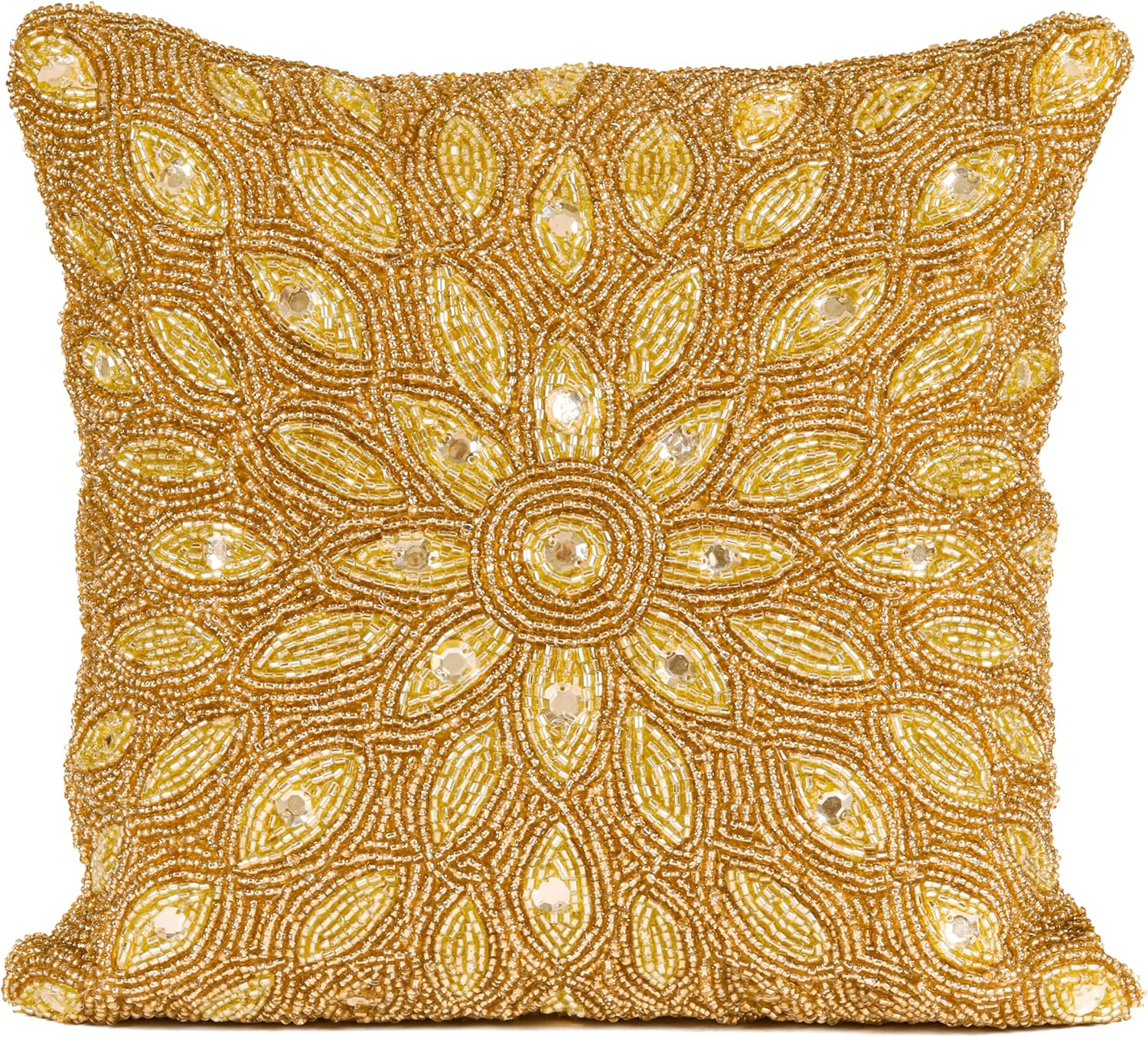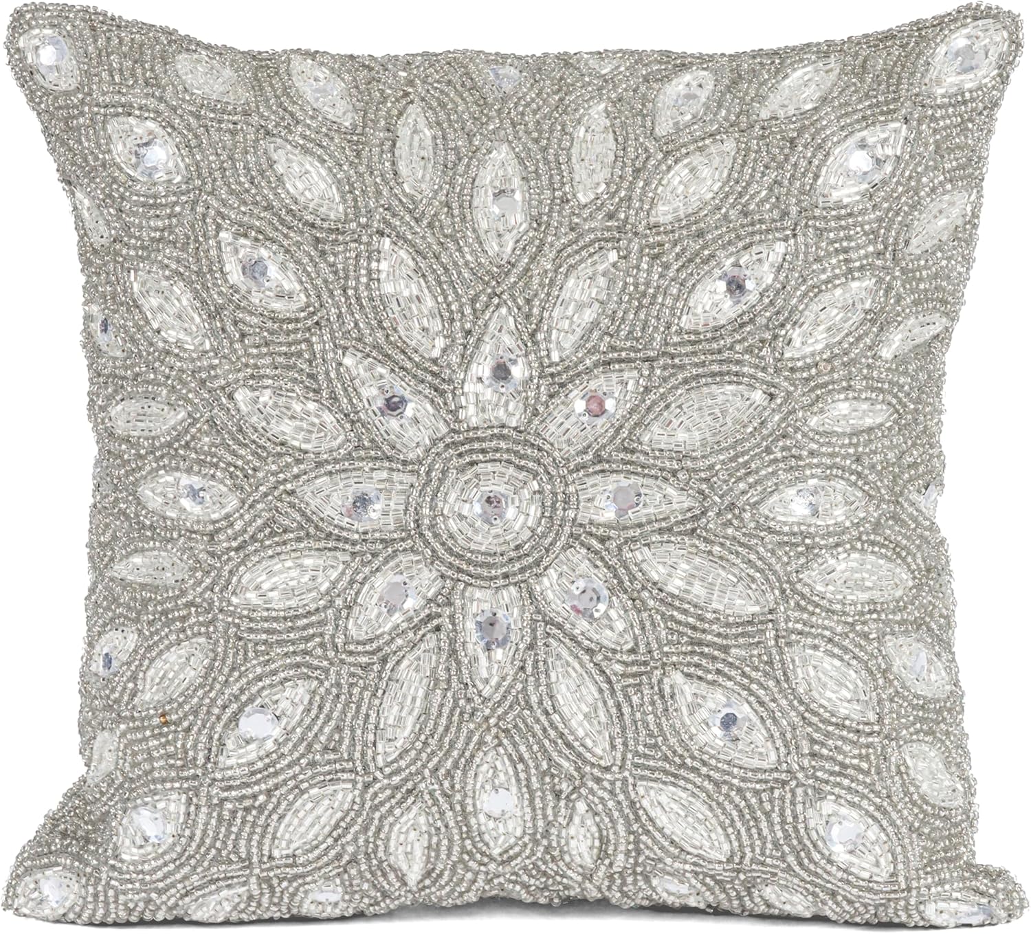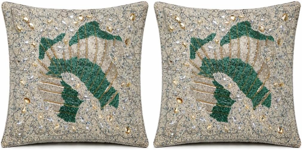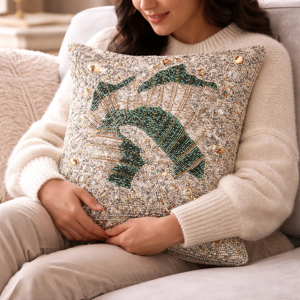 Olio Marfa Luxury Hand-Beaded Square Cushion Cover - 14x14" Set Of 2 ,Throw Pillow with Elegant Design - Handmade Accent Pillow by Indian Artisans -Wing designs Silver Teal Multi