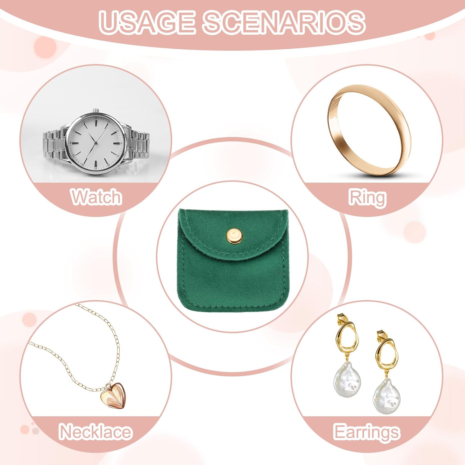 This is a practical and easy-to-carry storage Jewelry Pouch, which is very suitable for storing jewelry, necklaces, bracelets, watches, bracelets, earrings, rings, crystals, gifts, clips, brooches, keys, cards, beads, and other trinkets, allowing you to carry it easily and make your desktop, drawer or suitcase more tidy.SpecificationColor: Dark GreenMaterial: VelvetTotal Size: 6.5 x 6.5 cm / 2.5 x 2.5 Inch; 8 x 8 cm/3.1 x 3.1 InchPackage List: 24 Pcs x Dark Green Jewelry PouchesAdvantageSoft Material: The luxury jewelry gift bag is made of velvet, it is soft and light, comfortable to touch, and easy to carry, it can well protect your jewelry from scratches.Stable Stitching: The corners of the jewelry bag are tightly stitched, which is stable and not loose, and the metal buckle is not easy to fall off, durable, and not easy to fade, which is very suitable for traveling with jewelry.Snap Button Design: Velvet Cloth Pouches have a strong and hard snap button at the opening, which you can press and open freely, which can well prevent small things from slipping off and is convenient for your daily use.InstructionOpen the snap button, put the jewelry in the pocket, and close the snap button.NOTEPlease confirm the size of the pouches according to your needs before your order.