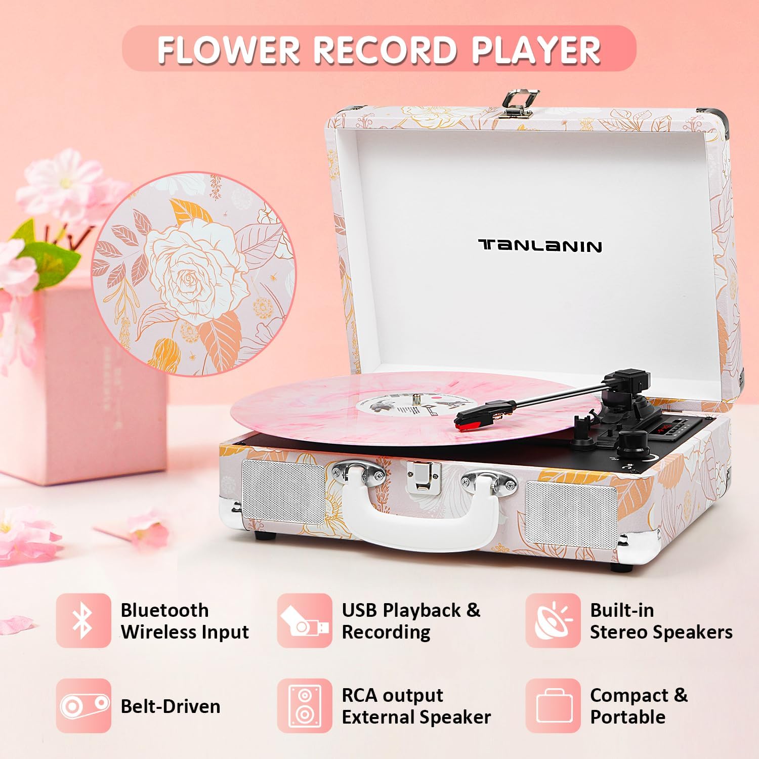 | Additional Features | Adjustable Speed (33-1/3, 45, 78 RPM), Belt Drive & Three-Point Spring Suspension, Built-in 2*5W Speaker & Bluetooth Receiver, Pink Rose Pattern & LED Display Screen, USB/TF Card Recording & Playback (Vinyl Music to Digital Format) |