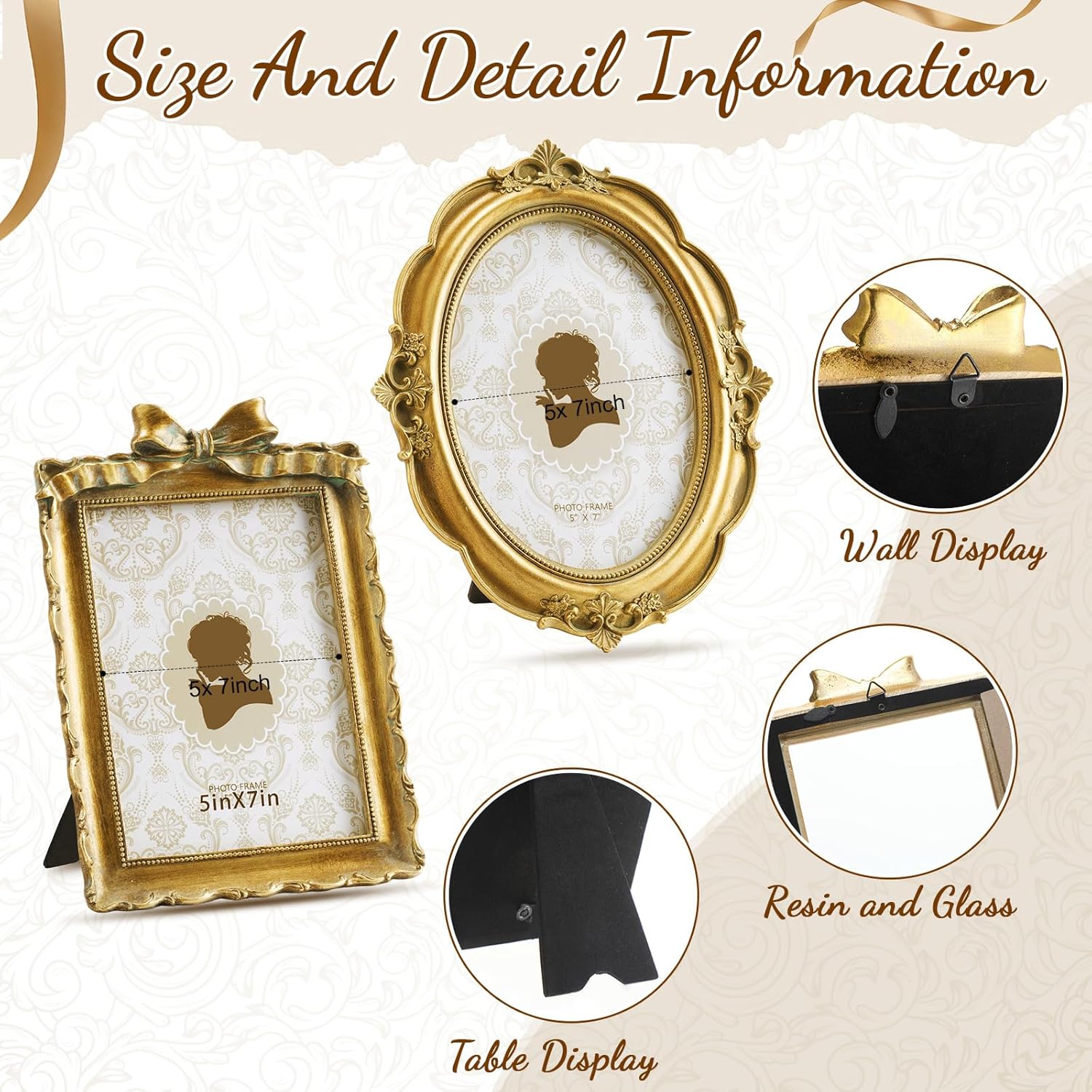 Features: It will be a nice decorative photo frame for living room, bedroom, or bathroom. This picture frames will look nice with any decor and fits any style of decoration, especially retro style. With its retro pattern and quality craftsmanship, this vintage frame 5 x 7 will be a delightful gift for family and friends in many occasions like wedding, anniversary, birthday, housewarming, baby shower, festivals and other special events. Specifications: Material: resin Color: gold Size: about 5 x 7 inches Package includes: 2 x Resin photo frames Notes: Manual measurement, please allow slight errors on size. The color may exist a slight difference due to different screen displays