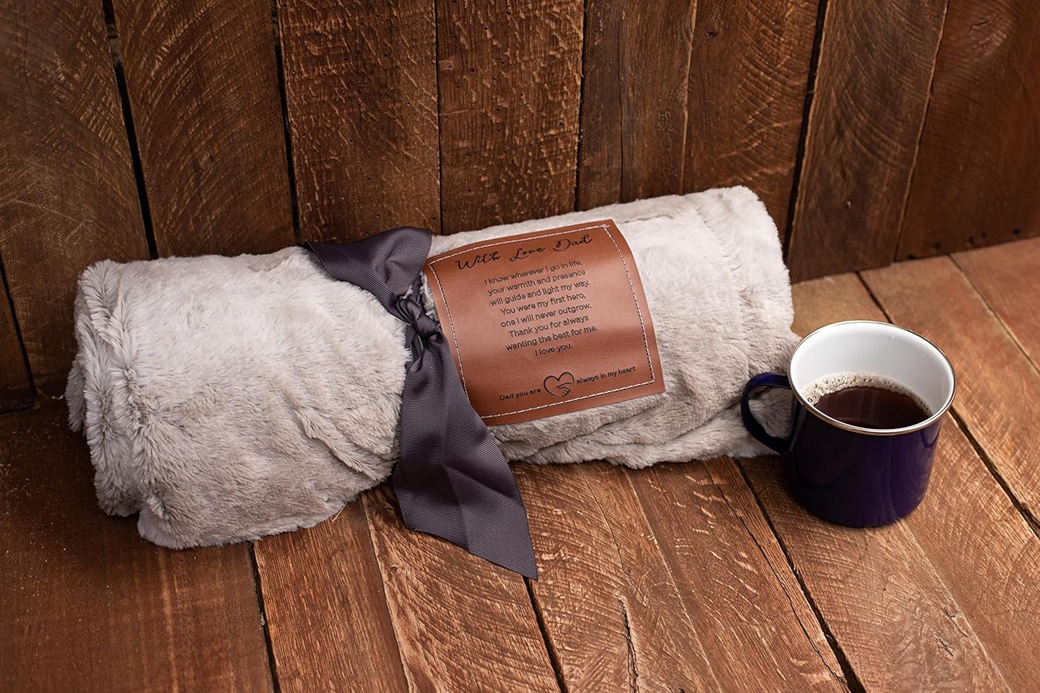 • HEARTFELT MESSAGE OF LOVE - Beautiful "With Love Dad" message (copyright Teri Harrison) comes embossed on a 5"x5" faux leather patch that is stitched to the blanket and is an adorable way to convey your love for Dad. Wrapping this special blanket around will make your dad feel the love and warmth of your relationship with him, whether when he is cuddled on a favorite chair, watching tv, reading, sleeping or spending time outdoors