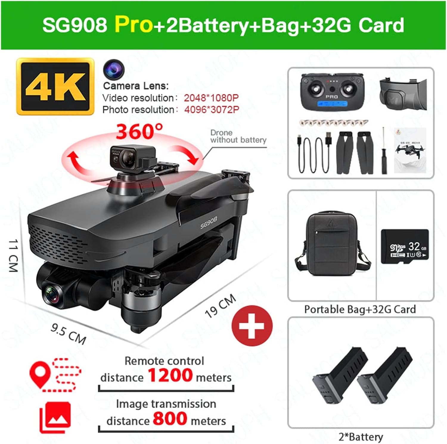 Name:SG908 MAX Drone New Function:360° Obstacle Avoidance + 3KM remote control distance +3km wifi distance Pressure sensor:Height setting Motor :1806 brushless motor Motor power:1700/KV Electric power adjustment:30A Smartphone WIFI Receiving method:5G WIFI Gimbal:Three - axis mechanical self - stabilizing head Lens:Self-stabilizing electronic anti-shake Lens Max remote control phone clip size:5.5inch Remote control battery:1.5V AA battery*4 (not included) Drone battery:7.6V 3400mAh Control distance (Free interference and no occlusion):1200M Wifi image transmission distance(Free interference and no occlusion):About 500-800m Flight time:About 26 min Charging time:About 6 hours USB Charging:5V Product size: unfold 32x40x8cm, fold 18x9x8cm Pixel:4K HD Camera Gimbal Angle(adjustment angle range) 110 ° automatic restores (Vertical) 65° automatic restores (Sideways) 45° automatic restores (Horizontal) Camera lens:Adjustable camera by transmitter, 110° GPS Follow me:30m IMAGE Follow me:1-5m Focal length:50X Hand gesture shooting/video reconization:1-5M Front camera: Video resolution:2048*1080(TF) SD mode:1208*720 (APP) HD mode:2048*1080(APP) Photo resolution:4096*3072P(TF) 4096*3072P(APP) Bottom camera: Video resolution:1280*720P Photo resolution:1280*720P Frame rate:25 fps Name:SG908 Pro Drone New Function:360° Obstacle Avoidance Pressure sensor:Height setting Motor :1806 brushless motor Motor power:1700/KV Electric power adjustment:30A Smartphone WIFI Receiving method:5G WIFI Gimbal:Three - axis mechanical self - stabilizing head Lens:Self-stabilizing electronic anti-shake Lens Max remote control phone clip size:5.5inch Remote control battery:1.5V AA battery*4 (not included) Drone battery:7.6V 3400mAh Control distance (Free interference and no occlusion):1200M Wifi image tr