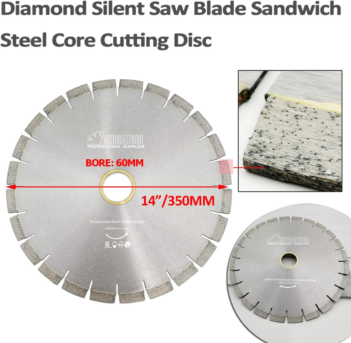 ‘==============Description============== ABOUT SHDIATOOL: We are a professional Manufacturer & Supplier of diamond tools in China, we could provide you following products used on Granite Marble Concrete Ceramic Tile Glass and Steel... Diamond Cutting Discs Saw Blades Diamond polishing pads Diamond grinding wheels Diamond drilling core bits Other Diamond tools accessory (router bits, engraving bits, backer....) If you have any needs or questions about our products,please contact to us firstly, thanks, we have good After-sales service, better quality and professional suggestions. ABOUT PRODUCTION: Item Name: Professional 14" Silent diamond blade for granite Specification: Diameter 14"/370MM, Arbor 60MM with a 50mm reducer washer, Diamond height 15MM, Segment thickness 3MM Quantity: 2pcs Application: Wet cutting granite slabs Feature: Formulated with high concentrated diamond Sandwich silent core steel cutting soundlessly, which is good for operater's Health Three Ply segments design provide good cutting performance and better finishing 15MM segment height provide much longer life =======The End=======