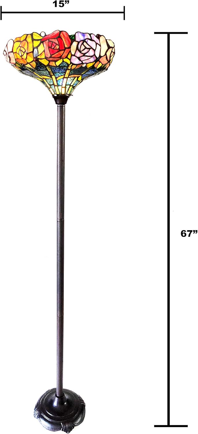If you're looking for a bit of a color pop in your home, this is the torchiere lamp for you! Featuring a foot switch and an antique bronze, 59" tall base, and a rose styled tiffany shade, made up of 360 pieces of hand cut, stained glass, and 2 glass beads. Each glass piece and glass bead is wrapped in a fine copper foil and soldered together using high heat, to form each unique, beautiful piece. It is hand created using the same technique developed by Louis Comfort Tiffany in the early 1900's. Each piece is unique, and is sure to catch everyone's eye with it's vibrant colors. Thank you for choosing Radiance Goods, proudly serving you from the US!