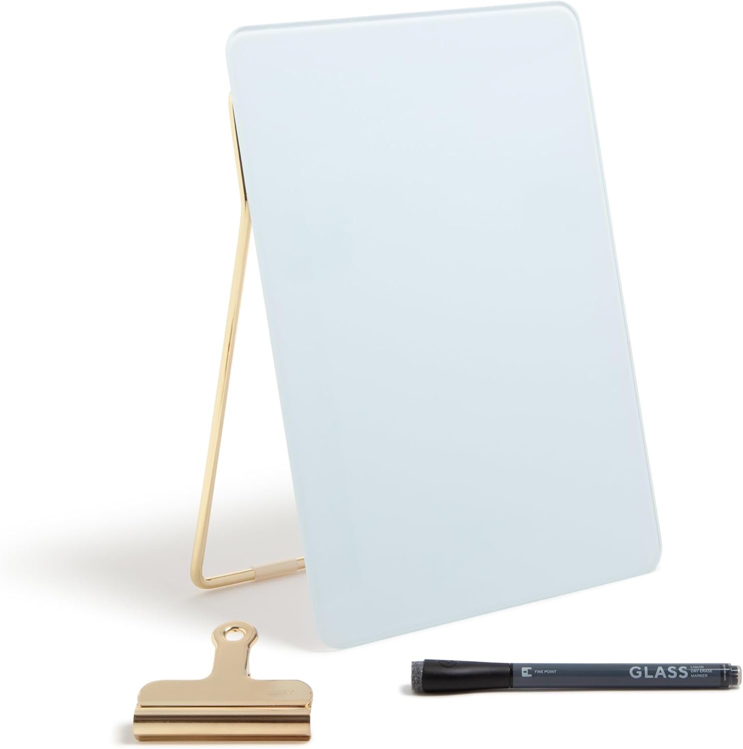 This Glass Dry Erase Desktop Easel Will Increase The Effifiency Of Your Desktop, Tempered Glass Surface Will Never Stain Or Ghost. Comes with Gold Metal Stand and Removable Clip. Notes Section For Planning. Lay Easel Flat Or Post Upright On Desk. Occasionally, Use Any Dry Erase Board Spray Or Wet Dry Erase Board Wipes After Continuous Use To Clean The Writing Surface. Although All Dry Erase Markers Work Well with This Board, The U Brands Dry Erase Markers Provide The Ultimate Writing and Eras-Ability Experience.